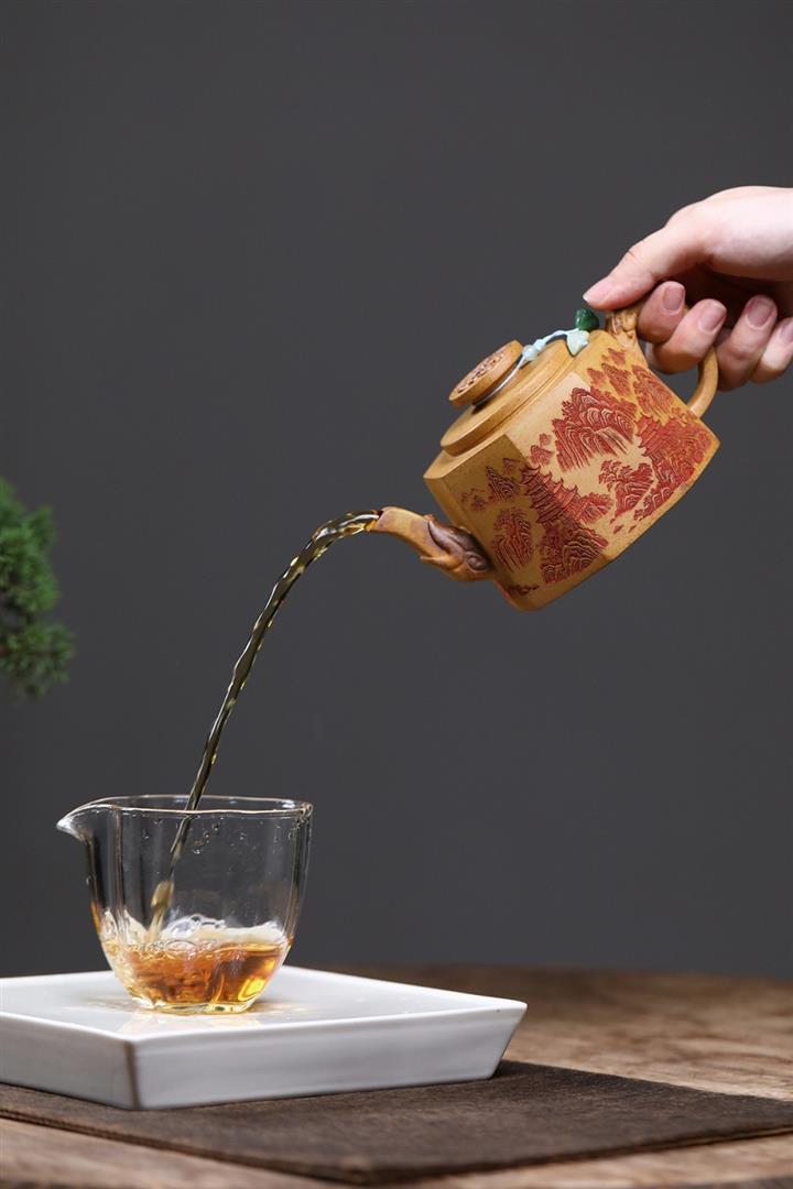 【泥料特點】砂土氣重,似淳實農民,日久使用,漸露鋒芒,養成變化,溫潤莊重。紫砂是壹種雙重氣孔結構的多孔性材質,氣孔微細,密度高。用紫砂壺沏茶,不失原味,且香不渙散,得茶之真香真味。紫砂使用越久,壺身色澤越發光亮照人,氣韻溫雅。紫砂壺長久使用器身會因撫摸擦拭,變得越發溫潤光澤。