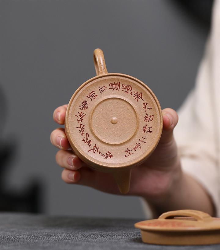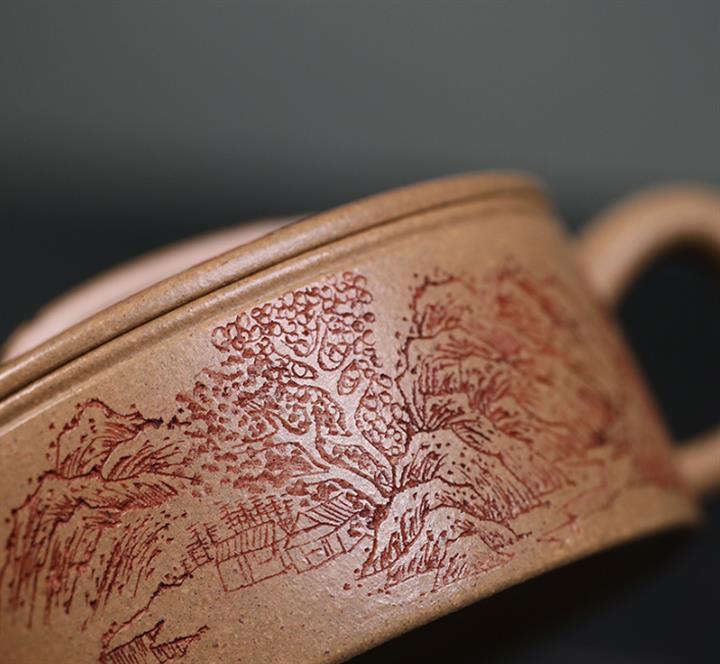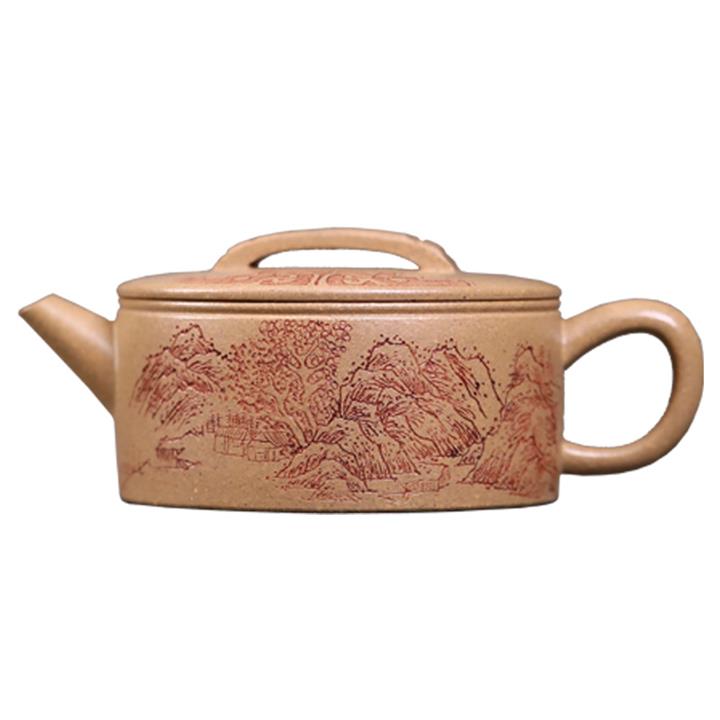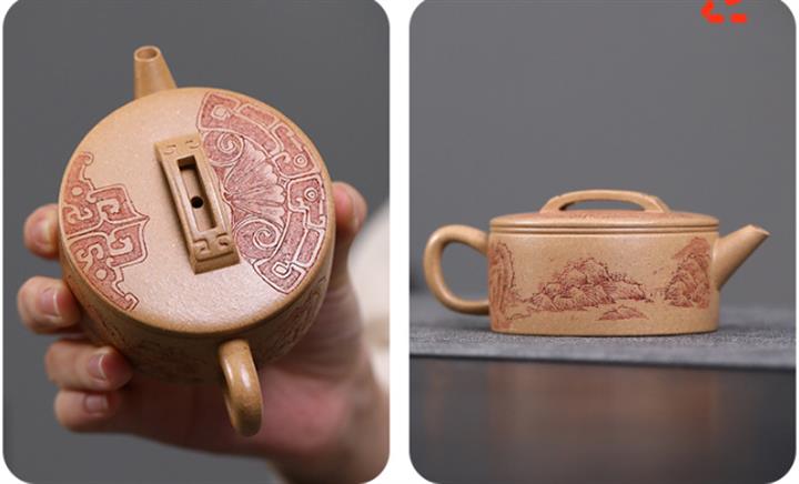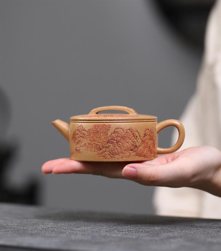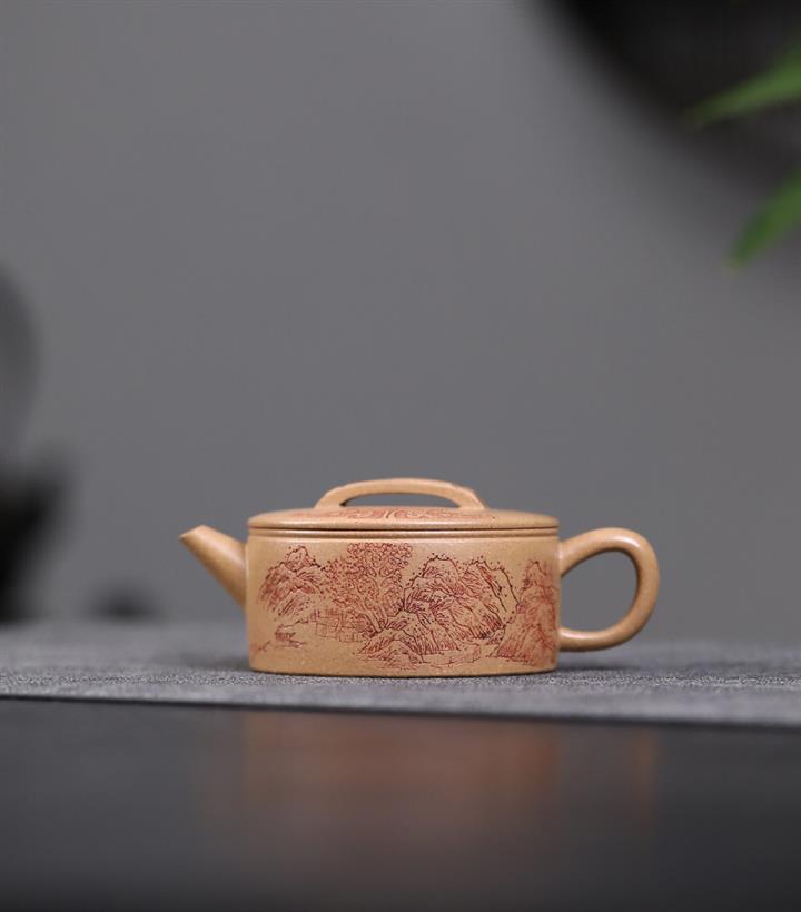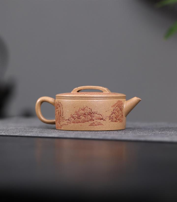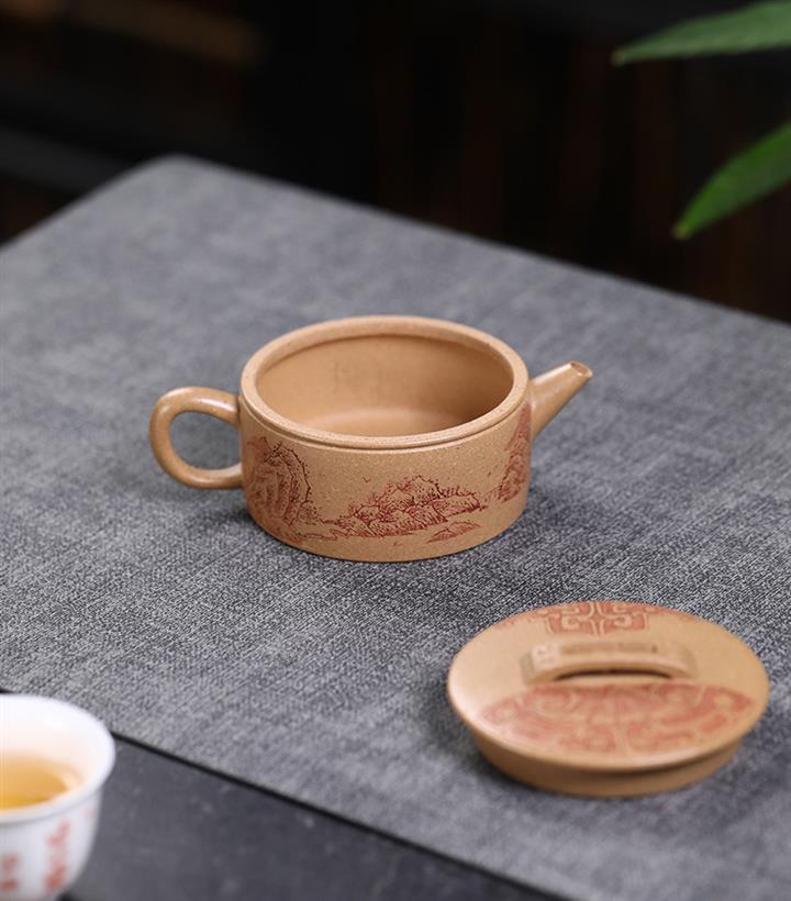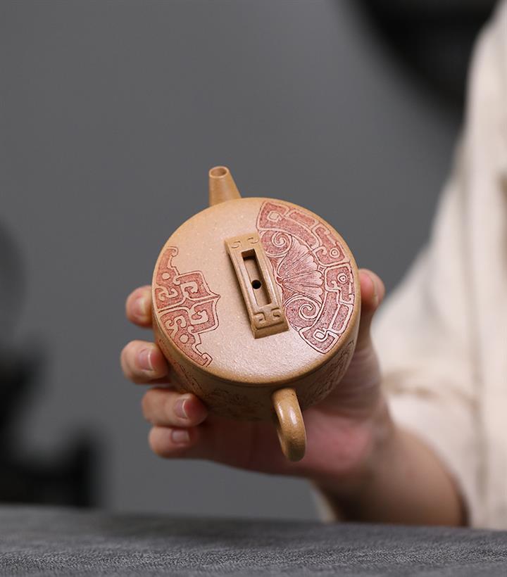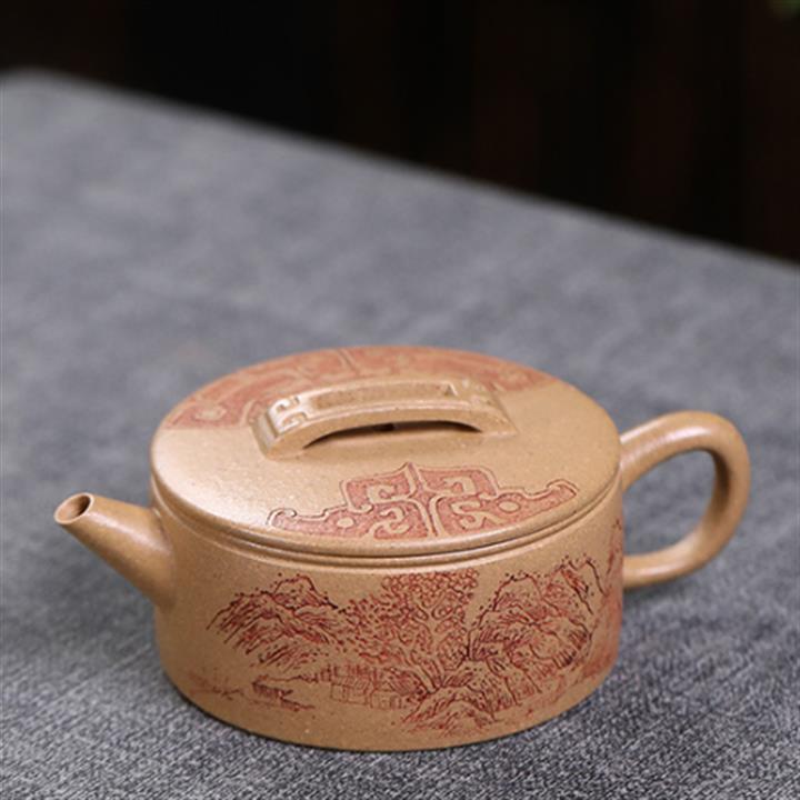 200cc原礦石黃滿身刻繪虛扁扁晨泡茶壺POT8273