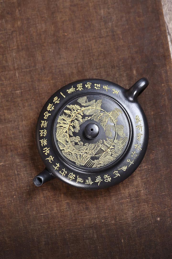 200cc原礦石黃滿身刻繪虛扁扁晨泡茶壺POT8273