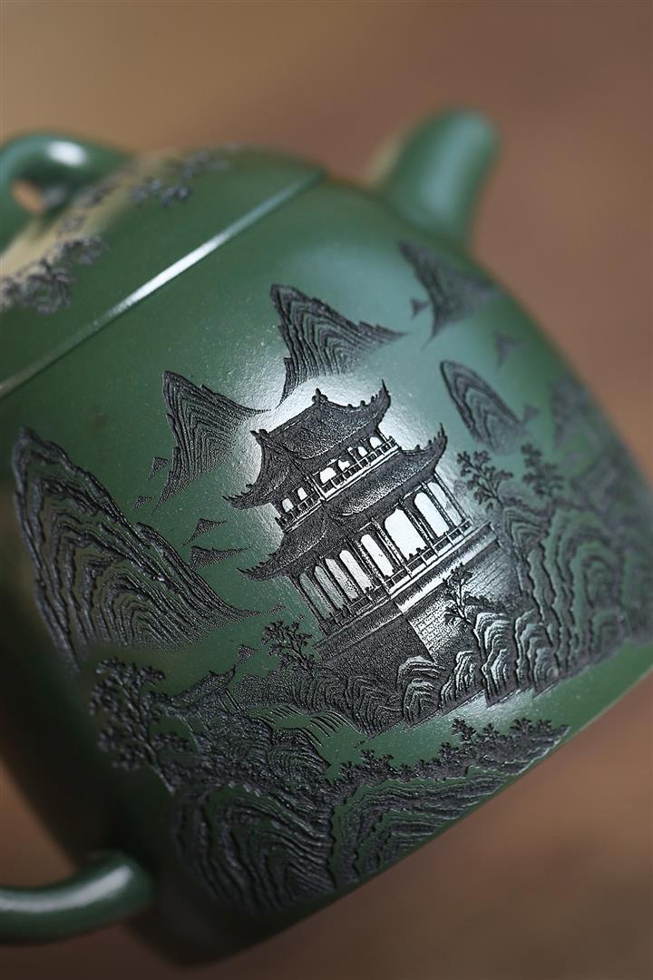 450cc原礦翡翠綠泥滿刻秦權茶壺POT8279