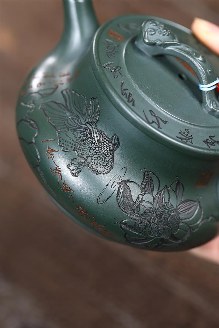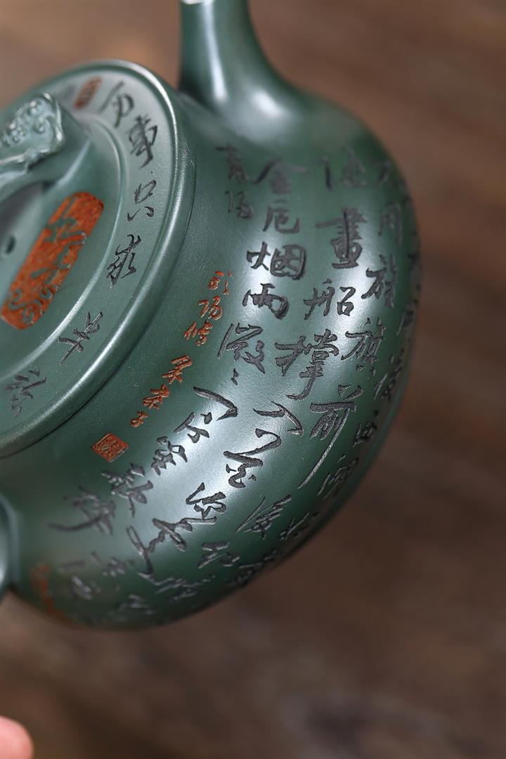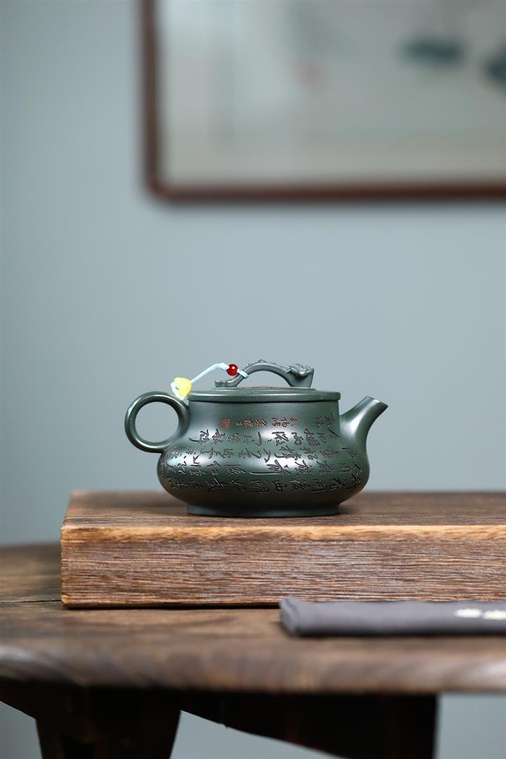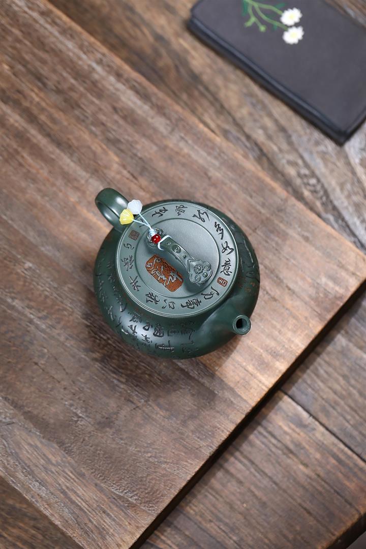 400cc原礦墨綠泥刻繪如意松趣茶壺POT8304