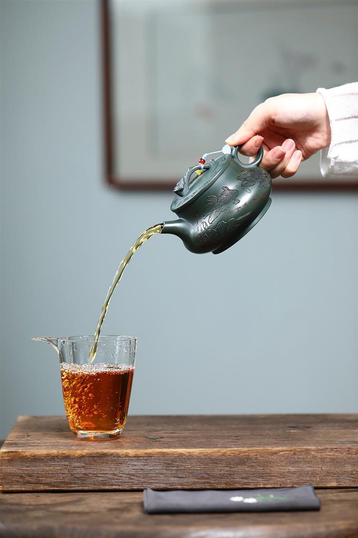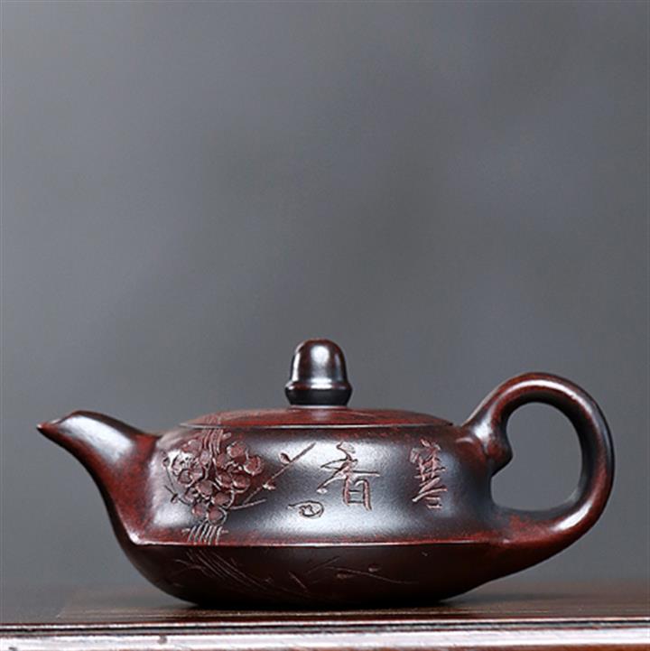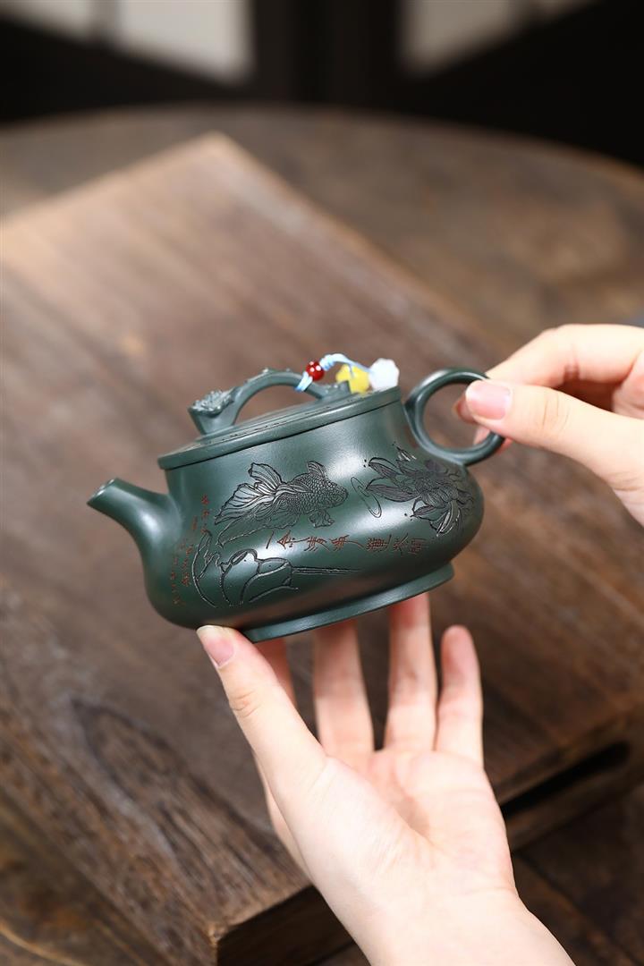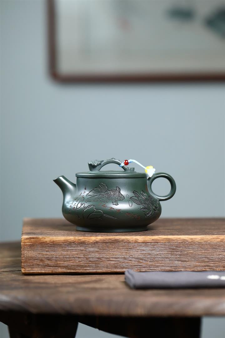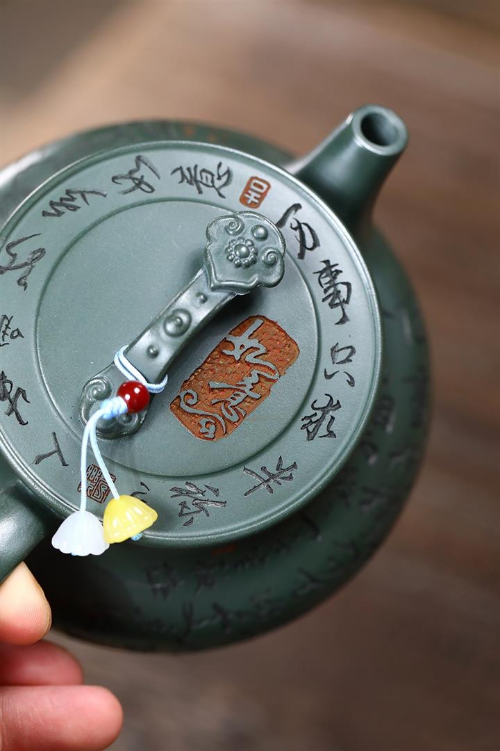 400cc原礦墨綠泥刻繪如意松趣茶壺POT8304
