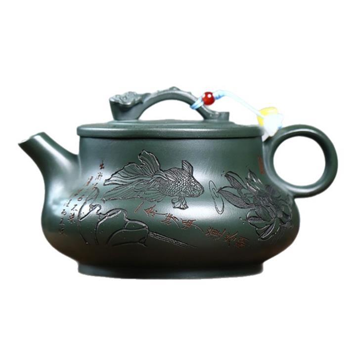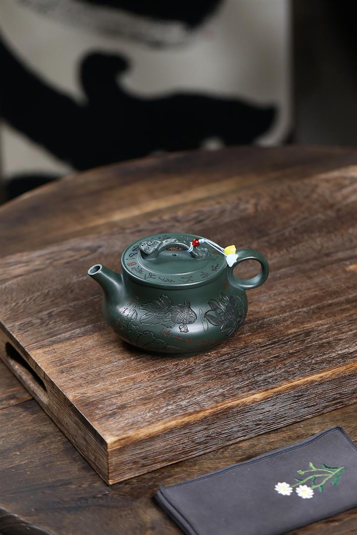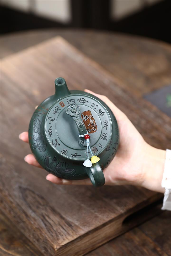 330cc原礦墨綠泥滿刻如意清荷茶壺POT8301