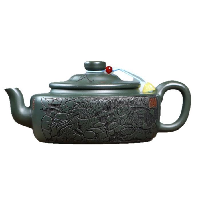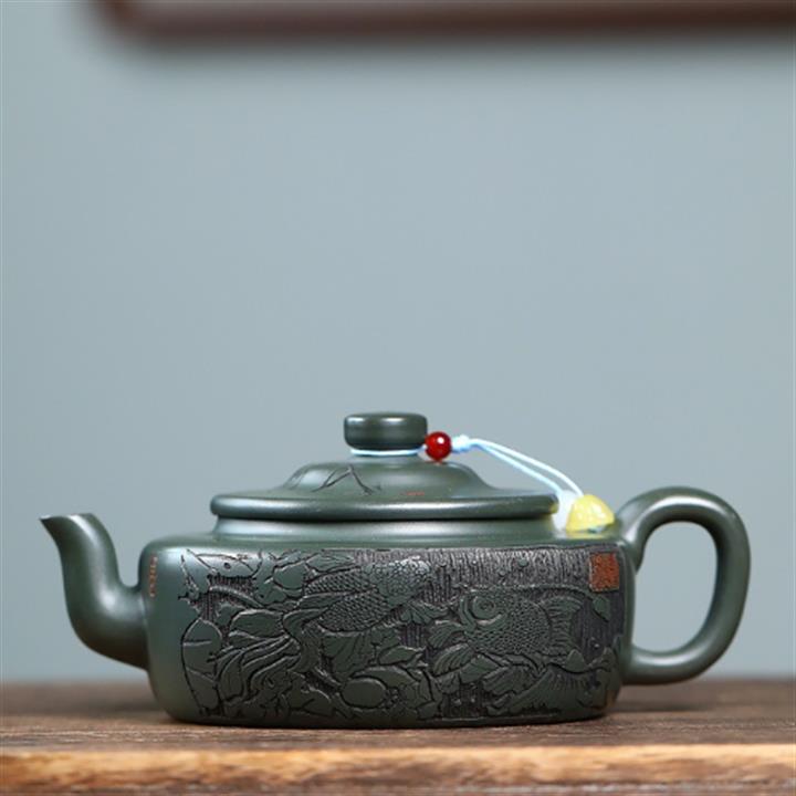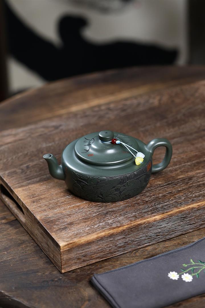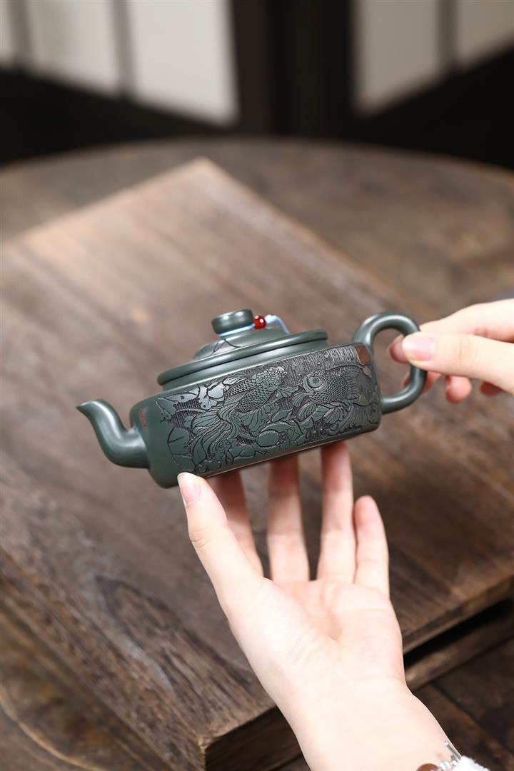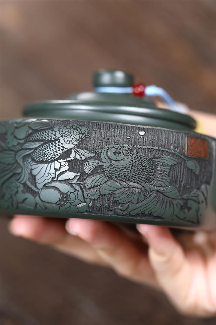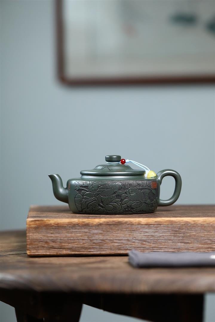 280cc原礦墨綠泥滿刻鯉躍荷塘茶壺POT8320