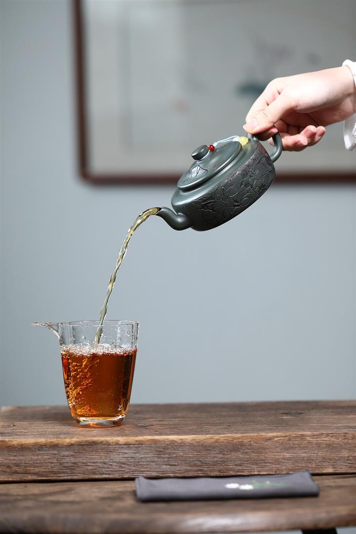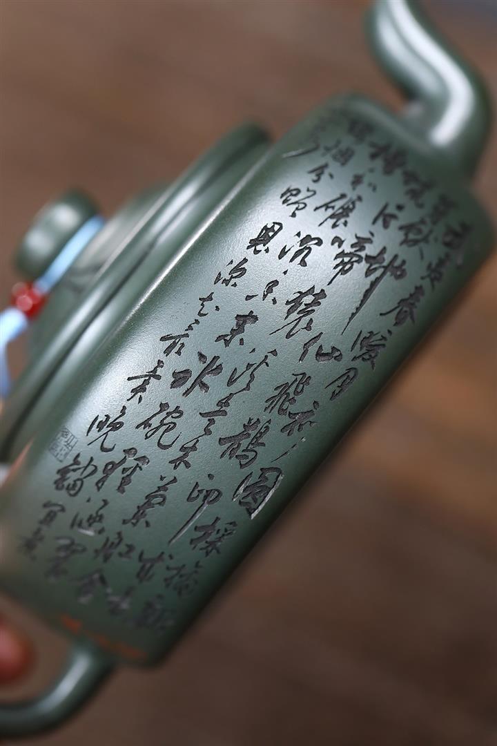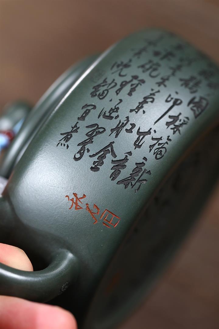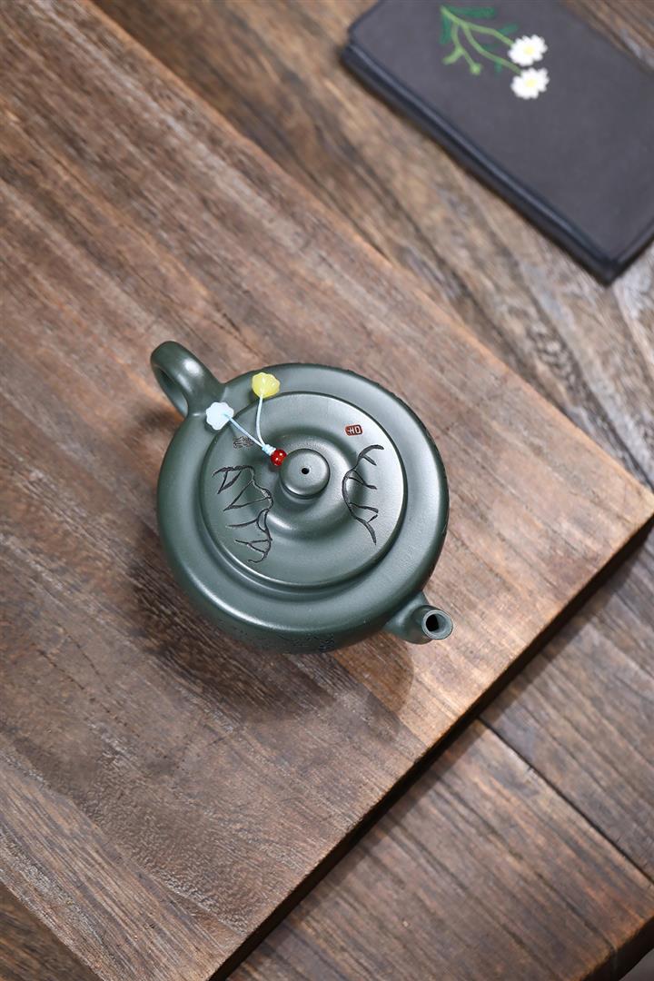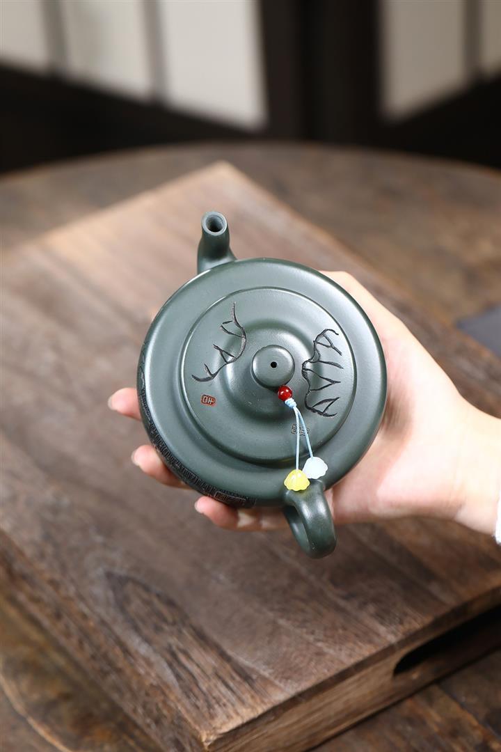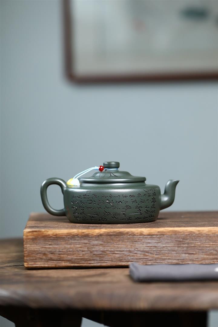 280cc原礦墨綠泥滿刻鯉躍荷塘茶壺POT8320