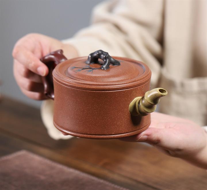 【泥料特點】砂土氣重,似淳實農民,日久使用,漸露鋒芒,養成變化,溫潤莊重。紫砂是壹種雙重氣孔結構的多孔性材質,氣孔微細,密度高。用紫砂壺沏茶,不失原味,且香不渙散,得茶之真香真味。紫砂使用越久,壺身色澤越發光亮照人,氣韻溫雅。紫砂壺長久使用器身會因撫摸擦拭,變得越發溫潤光澤。