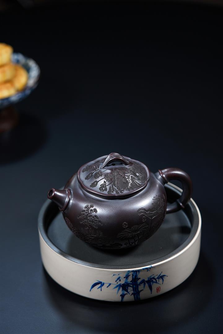 660cc原礦石紅泥滿刻山河鶴影茶壺POT8551