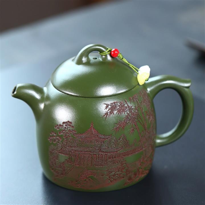 280cc原礦綠泥滿刻竹林松濤秦權茶壺POT8552