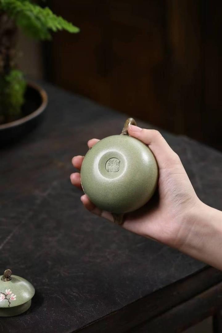 160cc原礦豆青砂泥雙色桃花茄瓜茶壺POT8577