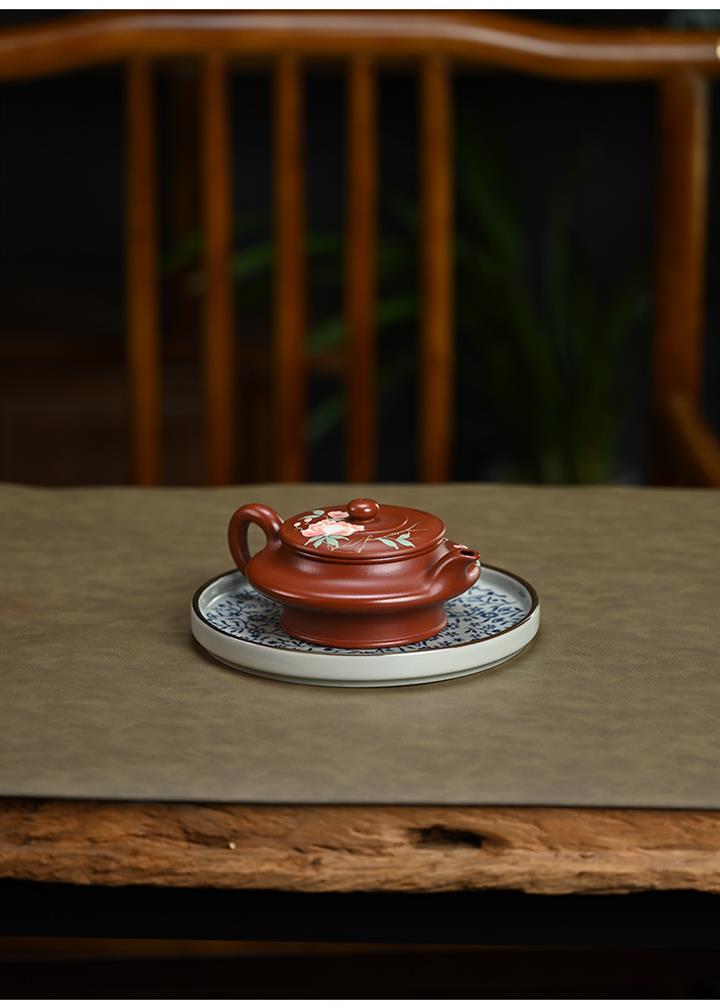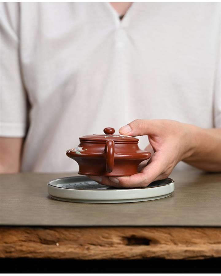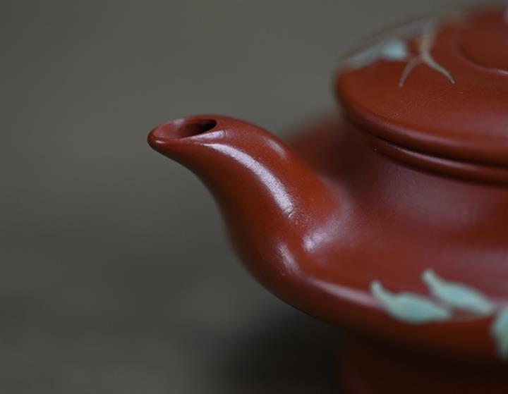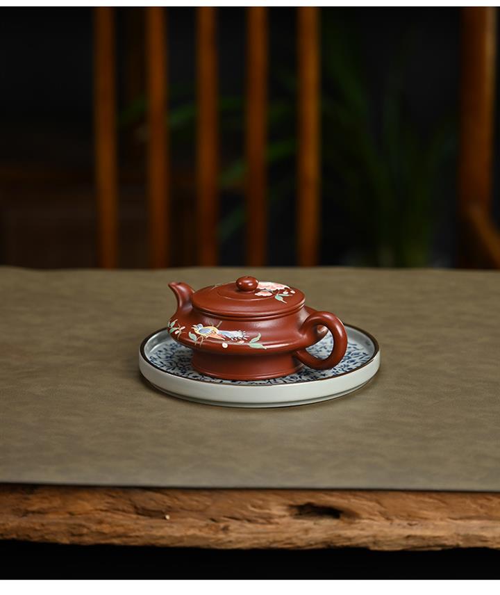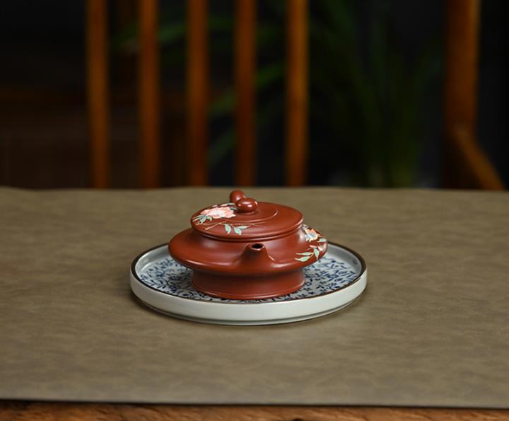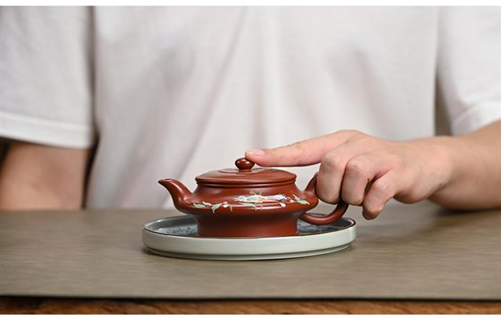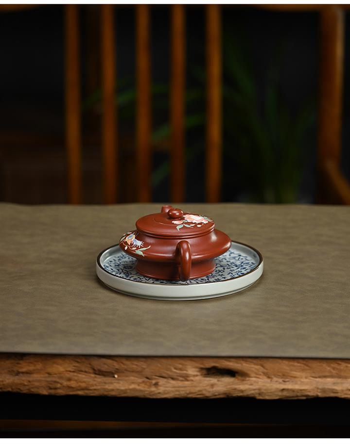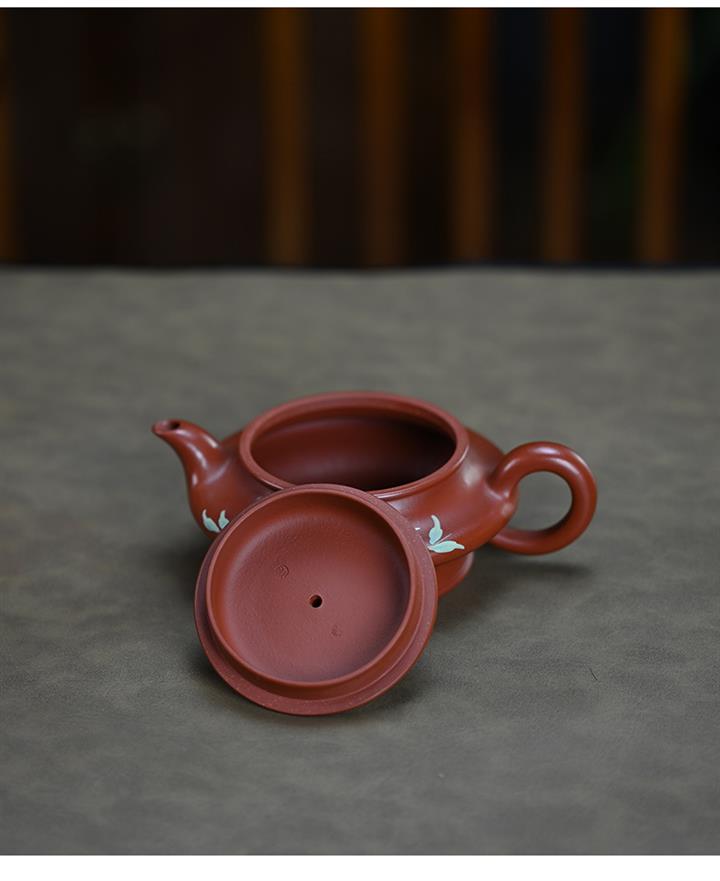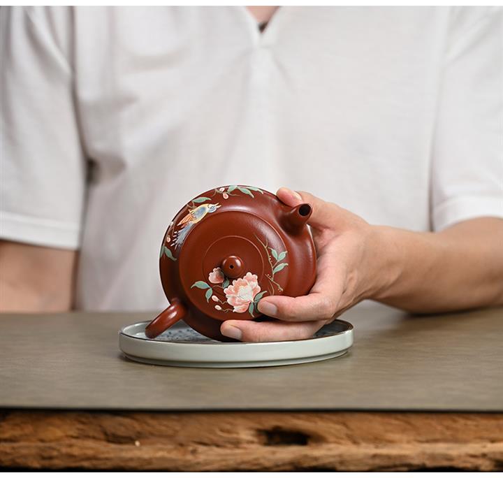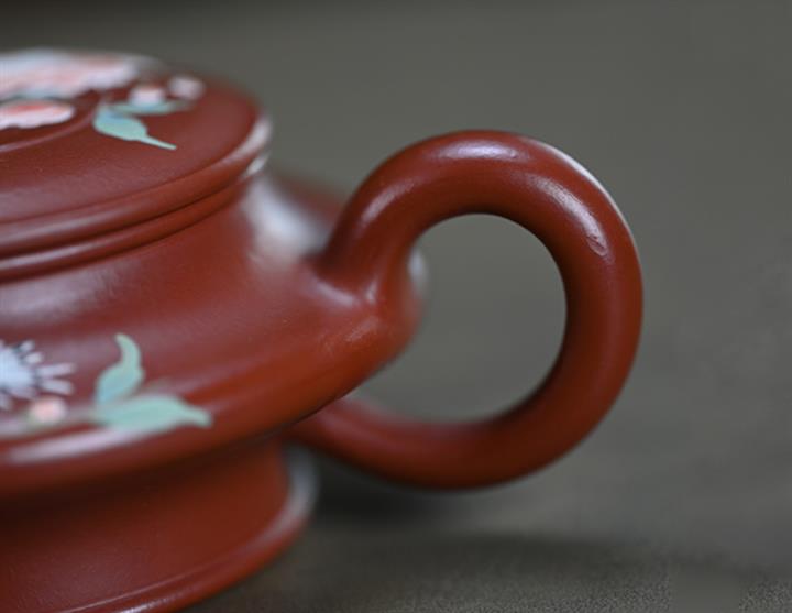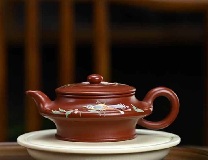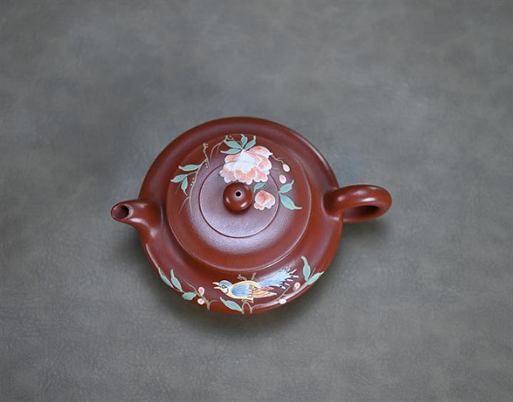 240cc原礦大紅袍彩繪花鳥虛扁茶壺POT8587