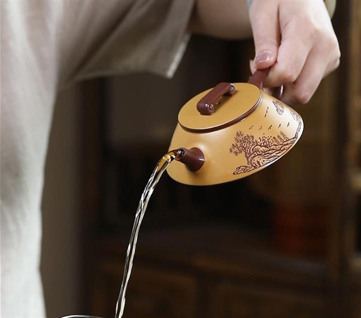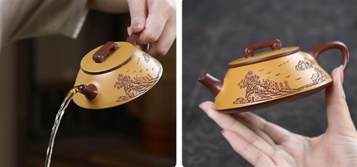 【泥料特點】砂土氣重,似淳實農民,日久使用,漸露鋒芒,養成變化,溫潤莊重。紫砂是壹種雙重氣孔結構的多孔性材質,氣孔微細,密度高。用紫砂壺沏茶,不失原味,且香不渙散,得茶之真香真味。紫砂使用越久,壺身色澤越發光亮照人,氣韻溫雅。紫砂壺長久使用器身會因撫摸擦拭,變得越發溫潤光澤。