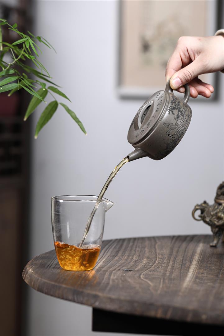 【泥料特點】砂土氣重,似淳實農民,日久使用,漸露鋒芒,養成變化,溫潤莊重。紫砂是壹種雙重氣孔結構的多孔性材質,氣孔微細,密度高。用紫砂壺沏茶,不失原味,且香不渙散,得茶之真香真味。紫砂使用越久,壺身色澤越發光亮照人,氣韻溫雅。紫砂壺長久使用器身會因撫摸擦拭,變得越發溫潤光澤。