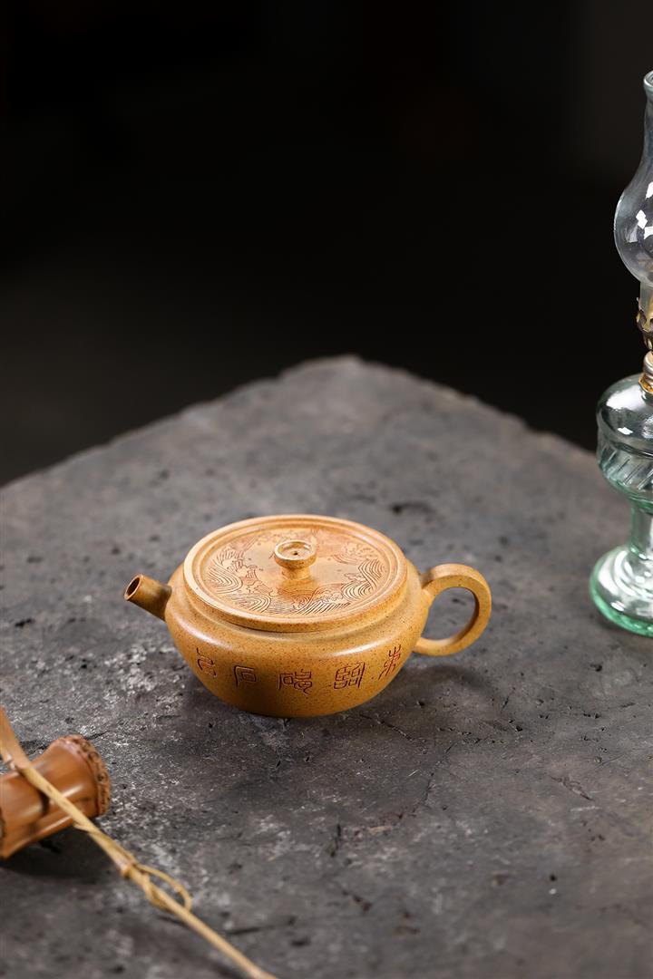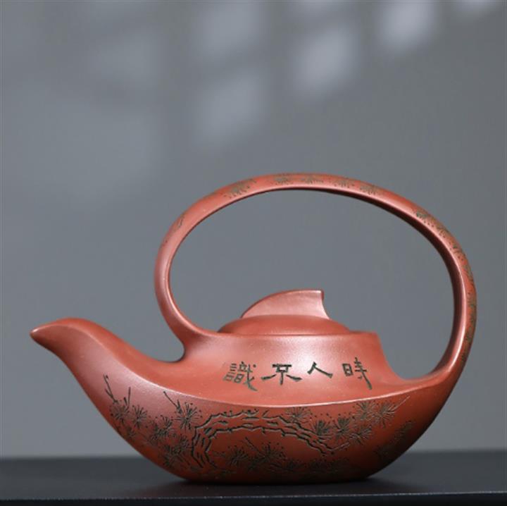 400cc原礦清水泥陶刻松影曲梁提梁茶壺POT8753