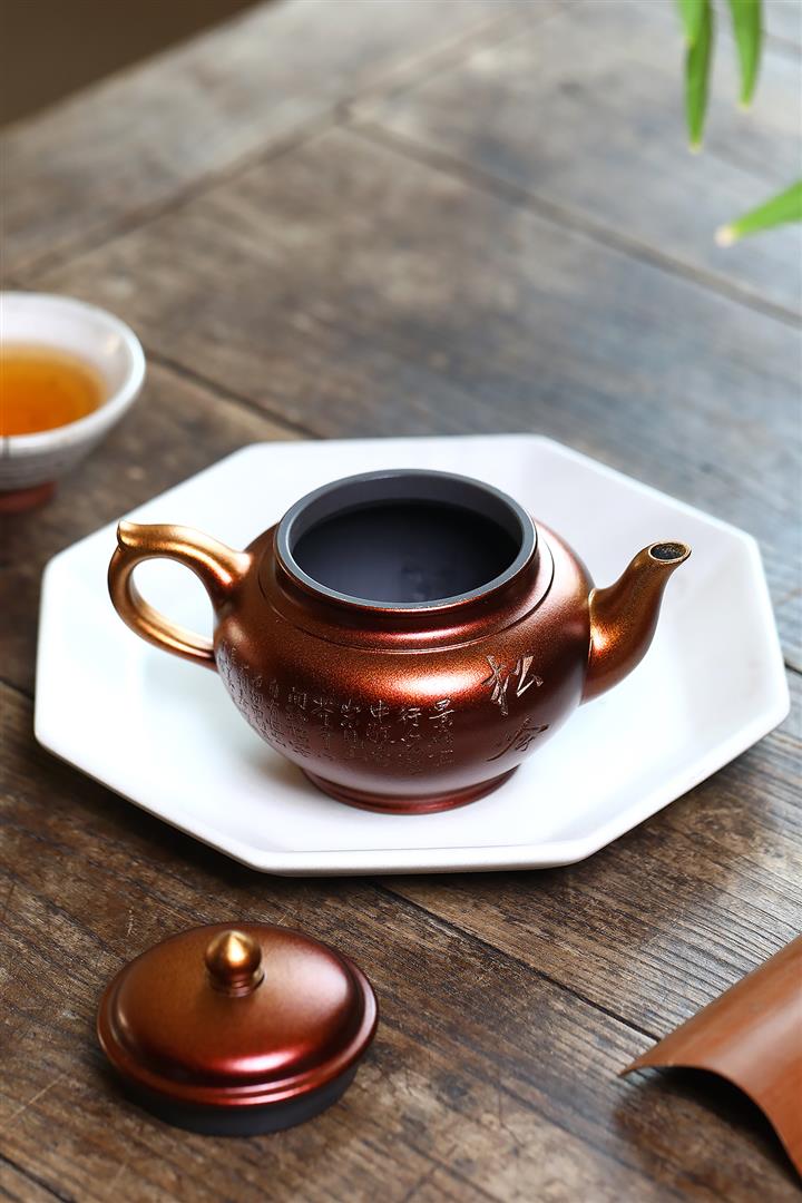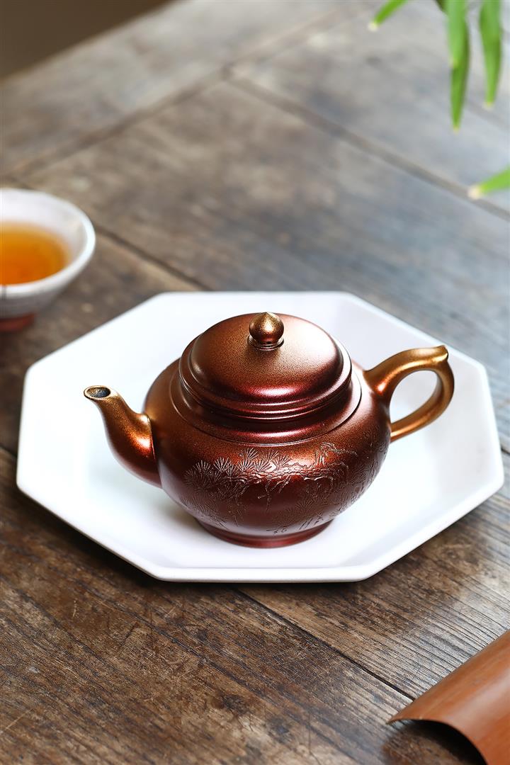 【泥料特點】砂土氣重,似淳實農民,日久使用,漸露鋒芒,養成變化,溫潤莊重。紫砂是壹種雙重氣孔結構的多孔性材質,氣孔微細,密度高。用紫砂壺沏茶,不失原味,且香不渙散,得茶之真香真味。紫砂使用越久,壺身色澤越發光亮照人,氣韻溫雅。紫砂壺長久使用器身會因撫摸擦拭,變得越發溫潤光澤。