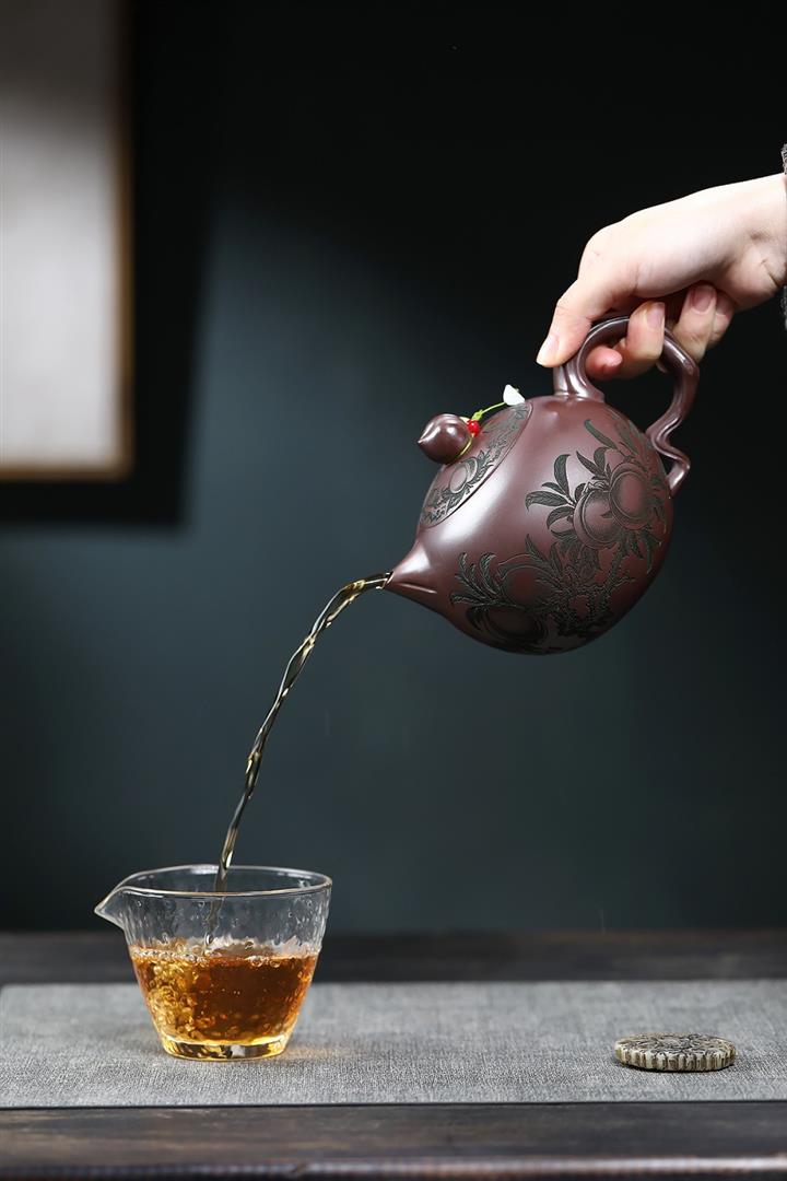 【泥料特點】砂土氣重,似淳實農民,日久使用,漸露鋒芒,養成變化,溫潤莊重。紫砂是壹種雙重氣孔結構的多孔性材質,氣孔微細,密度高。用紫砂壺沏茶,不失原味,且香不渙散,得茶之真香真味。紫砂使用越久,壺身色澤越發光亮照人,氣韻溫雅。紫砂壺長久使用器身會因撫摸擦拭,變得越發溫潤光澤。