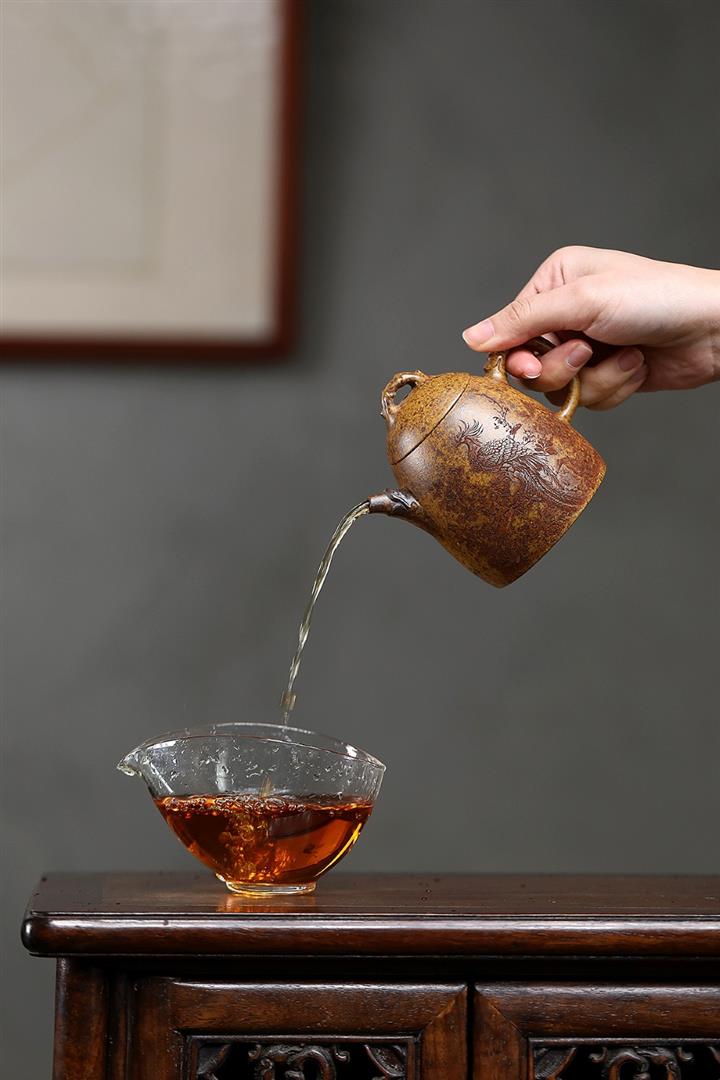【泥料特點】砂土氣重,似淳實農民,日久使用,漸露鋒芒,養成變化,溫潤莊重。紫砂是壹種雙重氣孔結構的多孔性材質,氣孔微細,密度高。用紫砂壺沏茶,不失原味,且香不渙散,得茶之真香真味。紫砂使用越久,壺身色澤越發光亮照人,氣韻溫雅。紫砂壺長久使用器身會因撫摸擦拭,變得越發溫潤光澤。