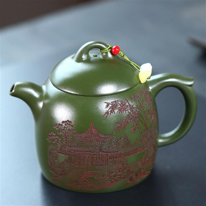 380cc原礦綠泥滿刻竹林松濤秦權茶壺POT9085