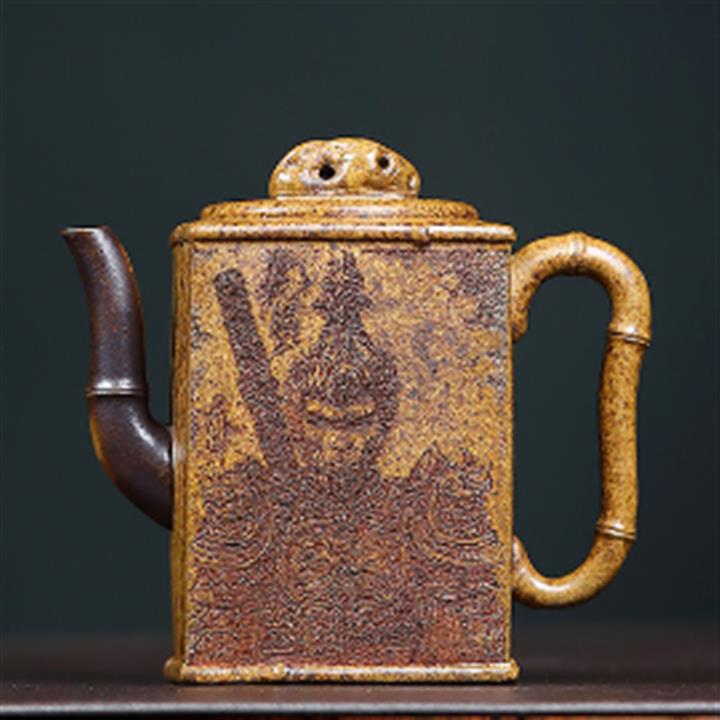 240cc原礦高溫柴燒龍骨金砂四方刻竹茶壺POT9103