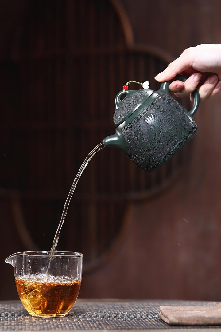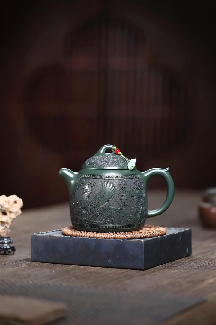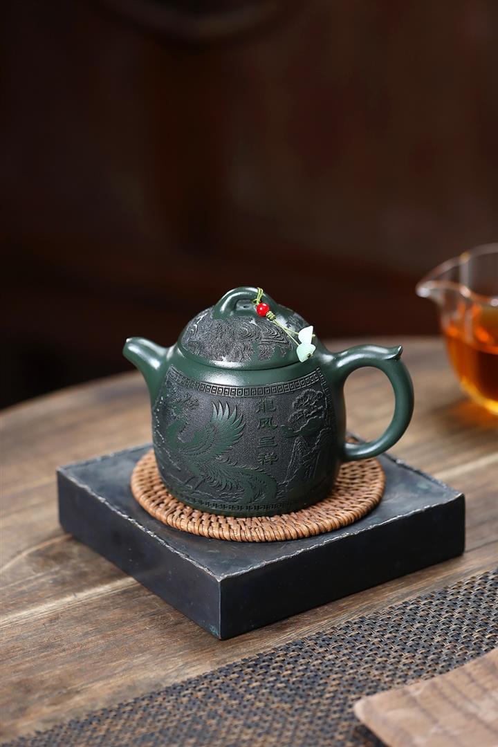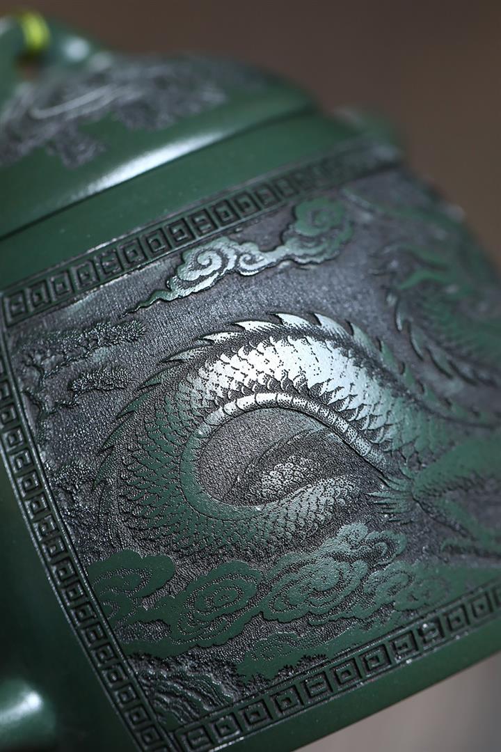 390cc原礦綠泥江山龍吟滿刻秦權茶壺POT9124