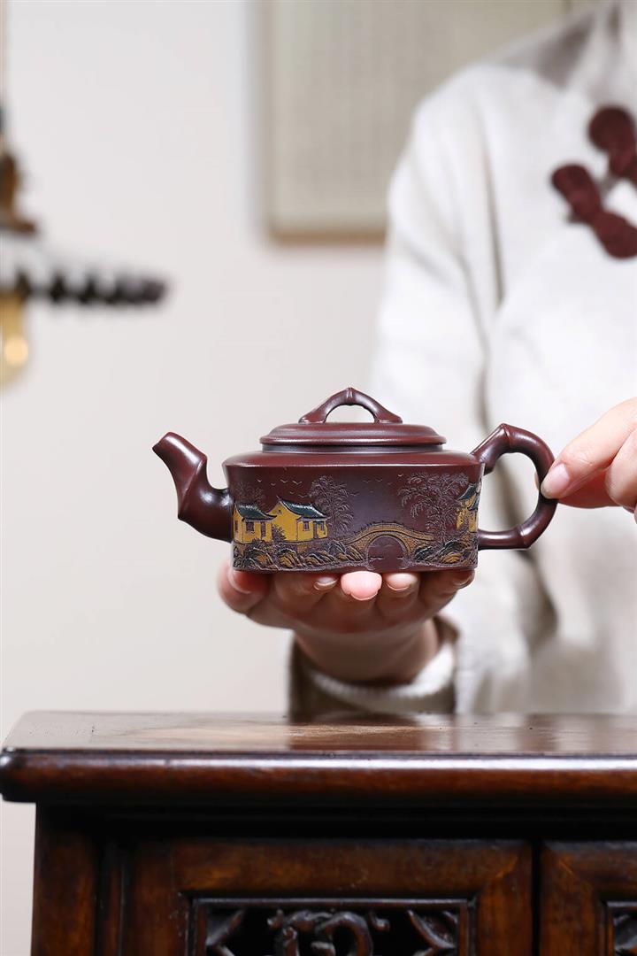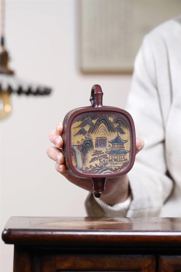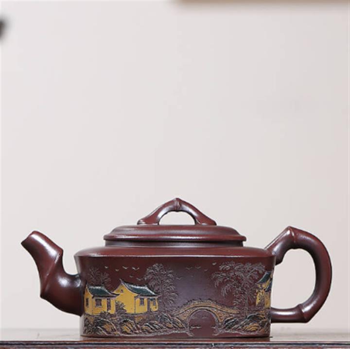 240cc原礦古烏泥彩刻四方竹節茶壺POT9148