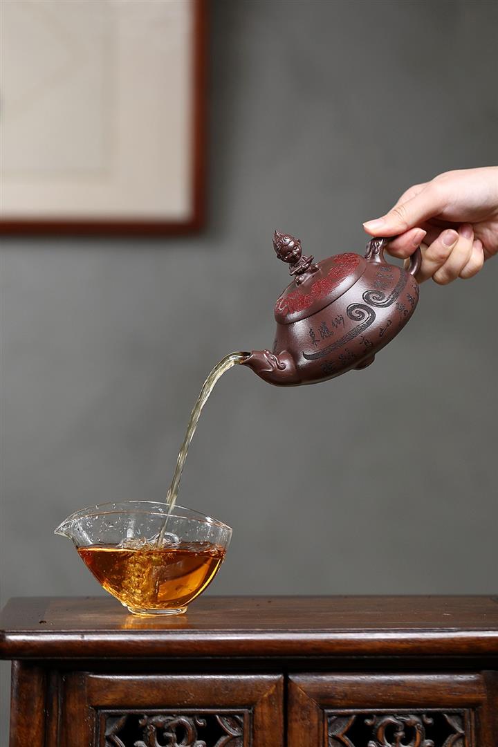 【泥料特點】砂土氣重,似淳實農民,日久使用,漸露鋒芒,養成變化,溫潤莊重。紫砂是壹種雙重氣孔結構的多孔性材質,氣孔微細,密度高。用紫砂壺沏茶,不失原味,且香不渙散,得茶之真香真味。紫砂使用越久,壺身色澤越發光亮照人,氣韻溫雅。紫砂壺長久使用器身會因撫摸擦拭,變得越發溫潤光澤。