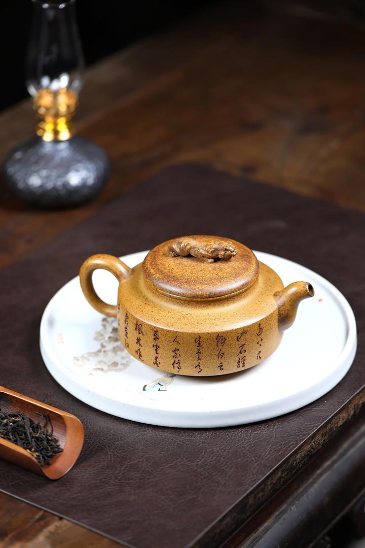 【泥料特點】砂土氣重,似淳實農民,日久使用,漸露鋒芒,養成變化,溫潤莊重。紫砂是壹種雙重氣孔結構的多孔性材質,氣孔微細,密度高。用紫砂壺沏茶,不失原味,且香不渙散,得茶之真香真味。紫砂使用越久,壺身色澤越發光亮照人,氣韻溫雅。紫砂壺長久使用器身會因撫摸擦拭,變得越發溫潤光澤。