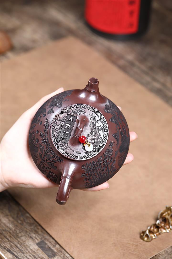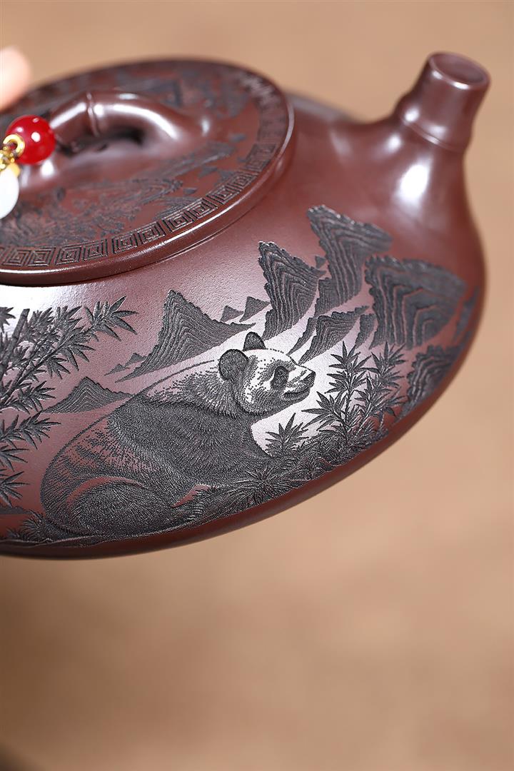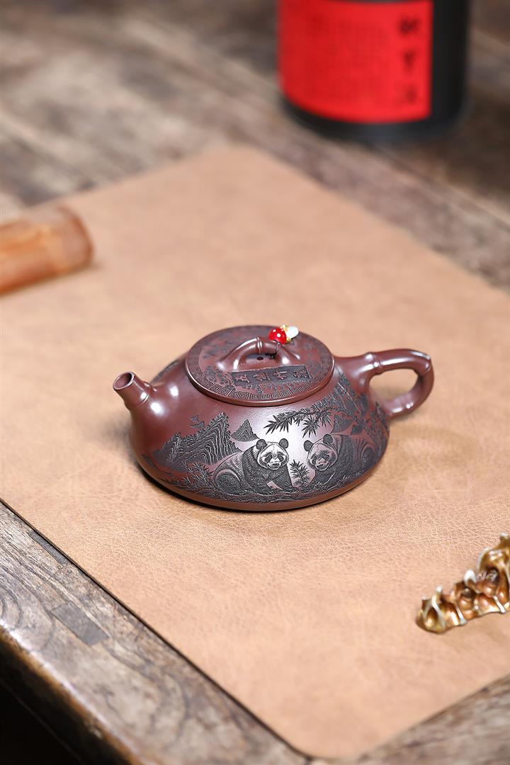 240cc原礦石紅刻繪熊貓竹瓢茶壺POT9276