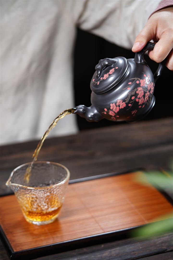 【泥料特點】砂土氣重,似淳實農民,日久使用,漸露鋒芒,養成變化,溫潤莊重。紫砂是壹種雙重氣孔結構的多孔性材質,氣孔微細,密度高。用紫砂壺沏茶,不失原味,且香不渙散,得茶之真香真味。紫砂使用越久,壺身色澤越發光亮照人,氣韻溫雅。紫砂壺長久使用器身會因撫摸擦拭,變得越發溫潤光澤。