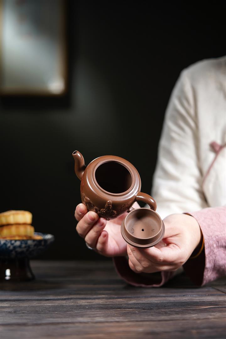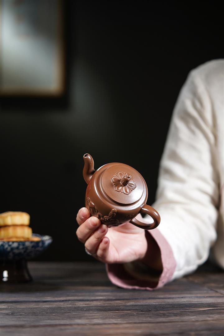 【泥料特點】砂土氣重,似淳實農民,日久使用,漸露鋒芒,養成變化,溫潤莊重。紫砂是壹種雙重氣孔結構的多孔性材質,氣孔微細,密度高。用紫砂壺沏茶,不失原味,且香不渙散,得茶之真香真味。紫砂使用越久,壺身色澤越發光亮照人,氣韻溫雅。紫砂壺長久使用器身會因撫摸擦拭,變得越發溫潤光澤。