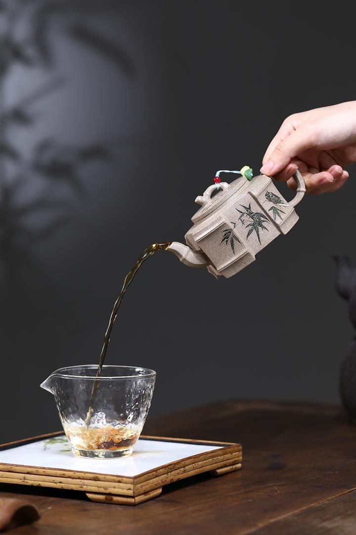 【泥料特點】砂土氣重,似淳實農民,日久使用,漸露鋒芒,養成變化,溫潤莊重。紫砂是壹種雙重氣孔結構的多孔性材質,氣孔微細,密度高。用紫砂壺沏茶,不失原味,且香不渙散,得茶之真香真味。紫砂使用越久,壺身色澤越發光亮照人,氣韻溫雅。紫砂壺長久使用器身會因撫摸擦拭,變得越發溫潤光澤。