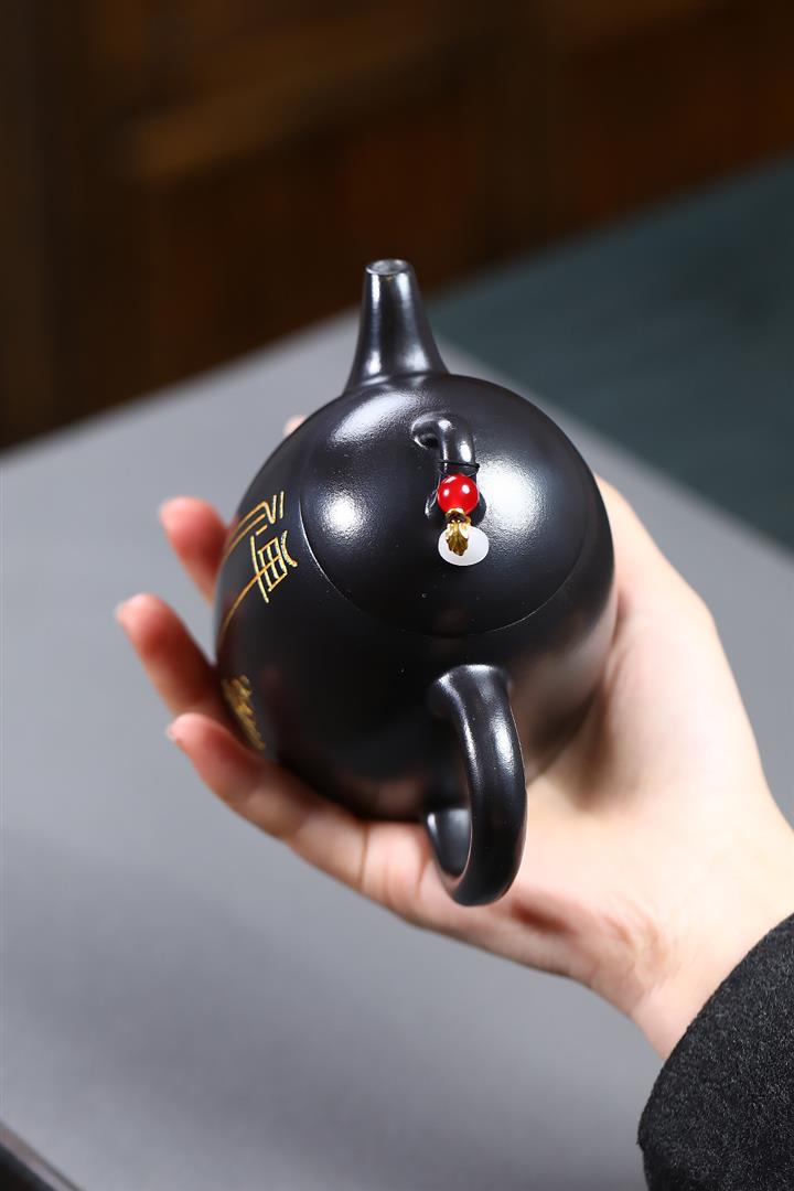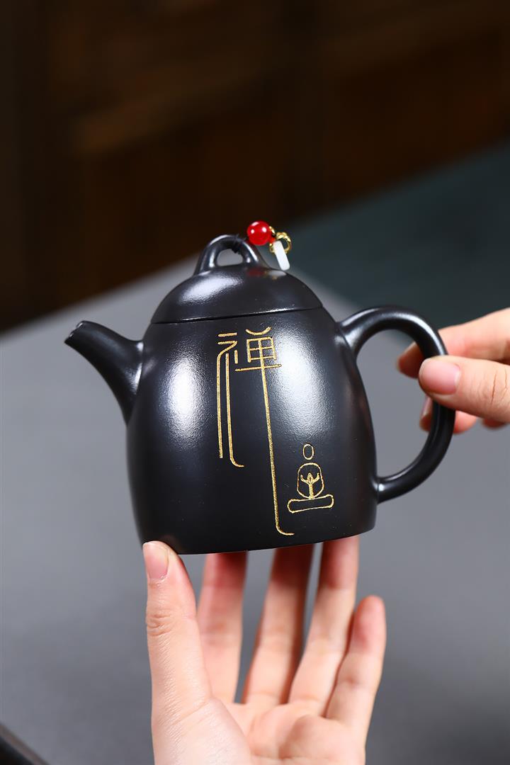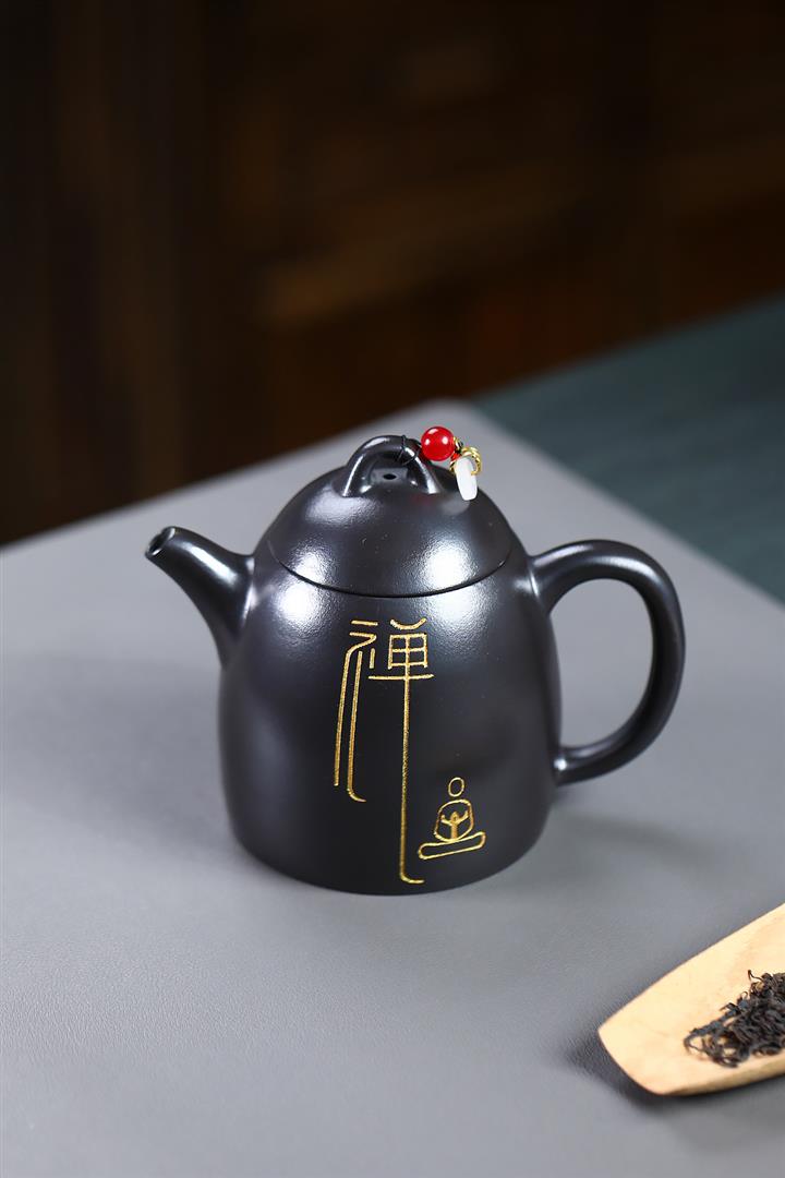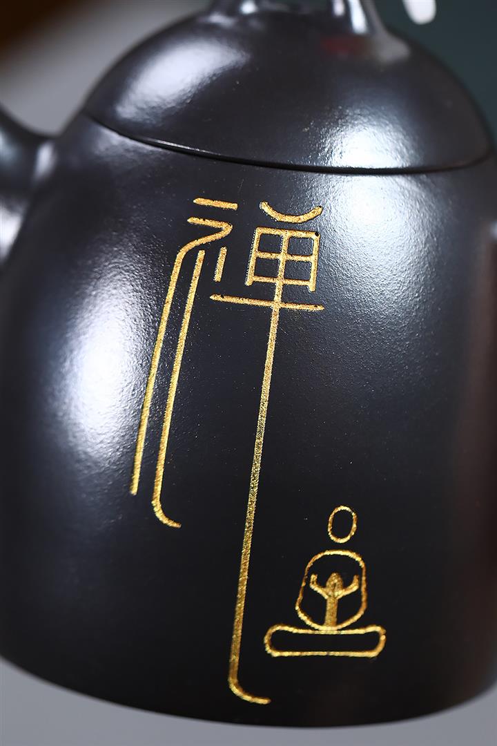 300cc原礦黑料六方金鐘滿彩刻長城泡茶壺POT9517