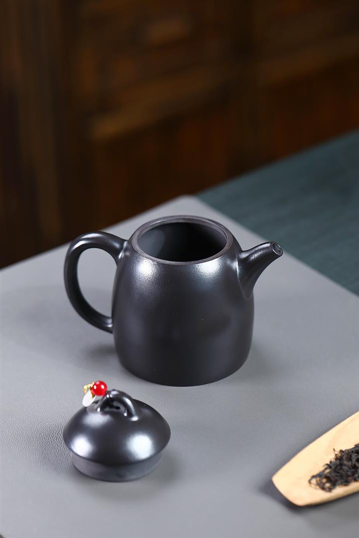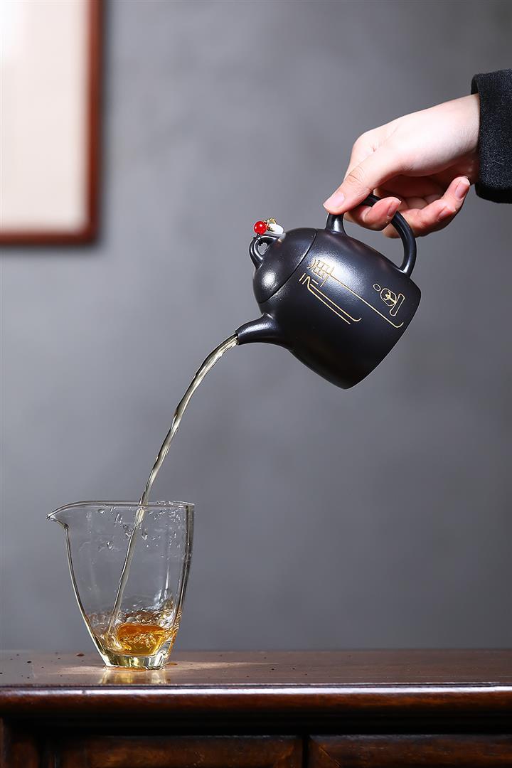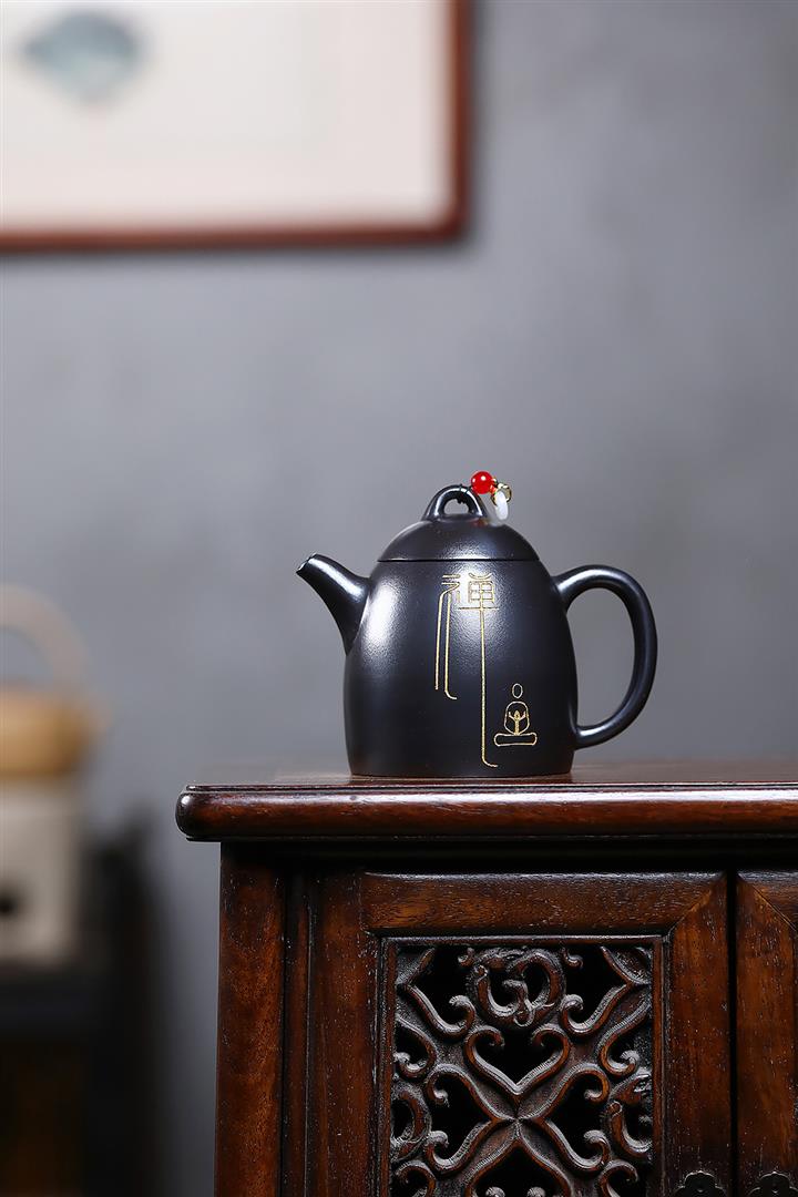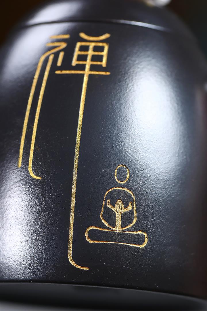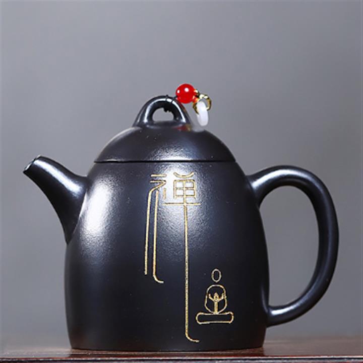 300cc原礦黑料六方金鐘滿彩刻長城泡茶壺POT9517