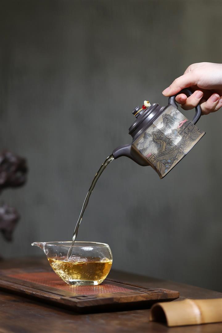 【泥料特點】砂土氣重,似淳實農民,日久使用,漸露鋒芒,養成變化,溫潤莊重。紫砂是壹種雙重氣孔結構的多孔性材質,氣孔微細,密度高。用紫砂壺沏茶,不失原味,且香不渙散,得茶之真香真味。紫砂使用越久,壺身色澤越發光亮照人,氣韻溫雅。紫砂壺長久使用器身會因撫摸擦拭,變得越發溫潤光澤。