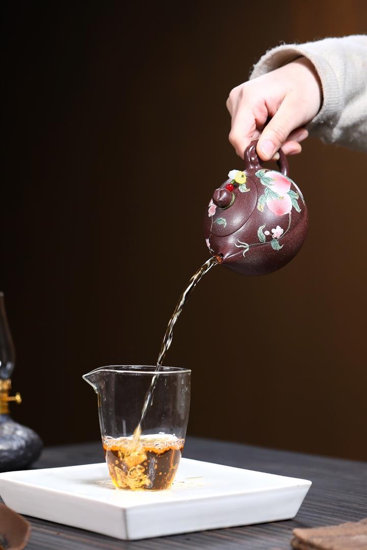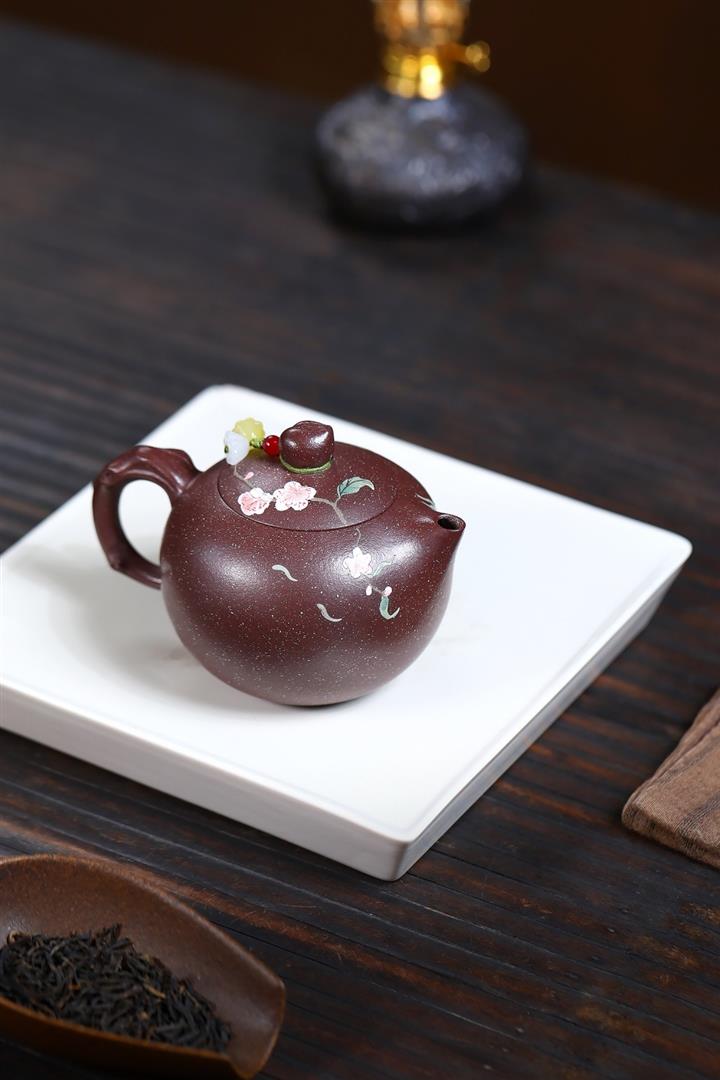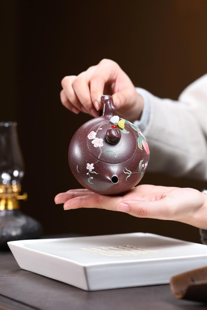 【泥料特點】砂土氣重,似淳實農民,日久使用,漸露鋒芒,養成變化,溫潤莊重。紫砂是壹種雙重氣孔結構的多孔性材質,氣孔微細,密度高。用紫砂壺沏茶,不失原味,且香不渙散,得茶之真香真味。紫砂使用越久,壺身色澤越發光亮照人,氣韻溫雅。紫砂壺長久使用器身會因撫摸擦拭,變得越發溫潤光澤。