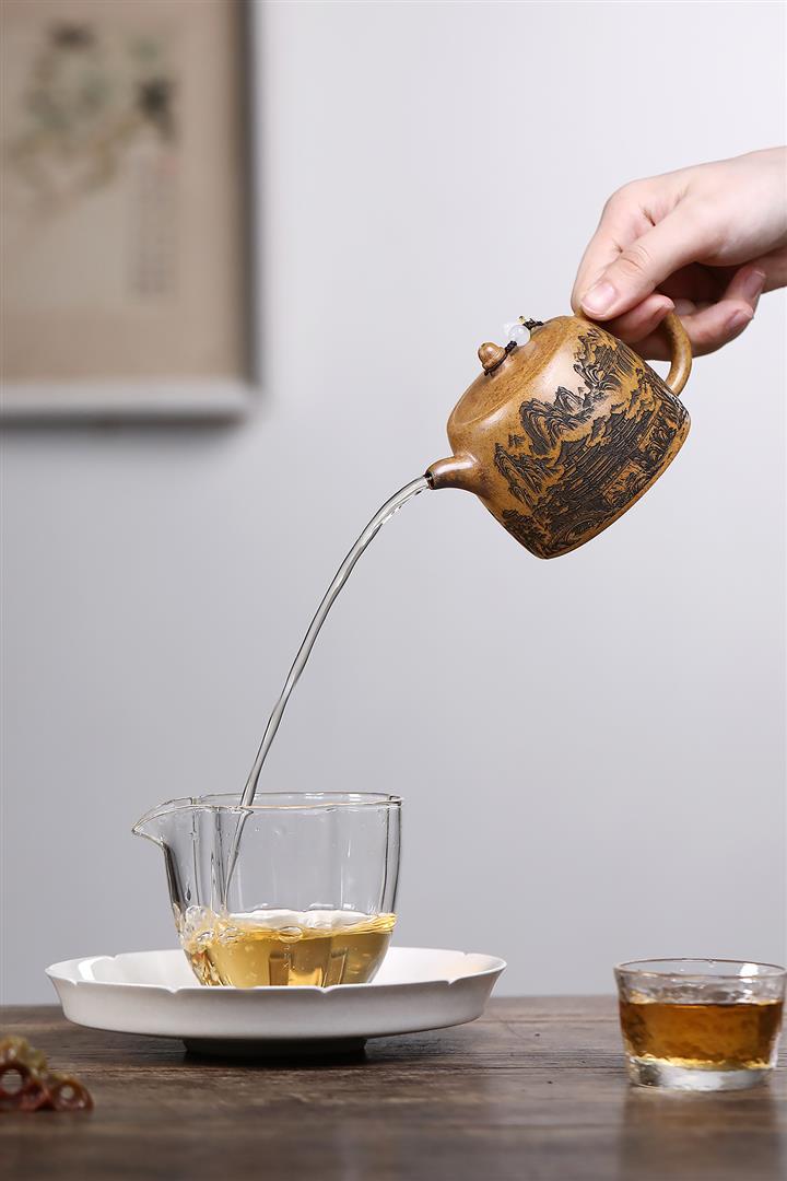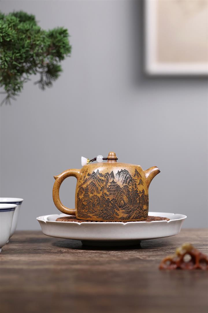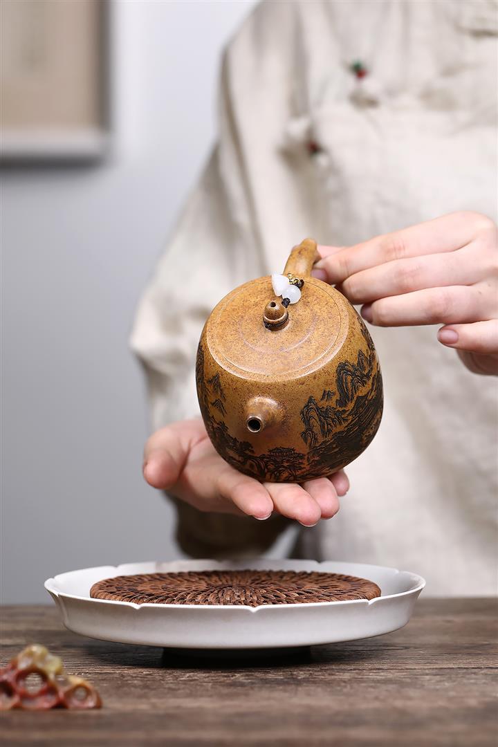 【泥料特點】砂土氣重,似淳實農民,日久使用,漸露鋒芒,養成變化,溫潤莊重。紫砂是壹種雙重氣孔結構的多孔性材質,氣孔微細,密度高。用紫砂壺沏茶,不失原味,且香不渙散,得茶之真香真味。紫砂使用越久,壺身色澤越發光亮照人,氣韻溫雅。紫砂壺長久使用器身會因撫摸擦拭,變得越發溫潤光澤。
