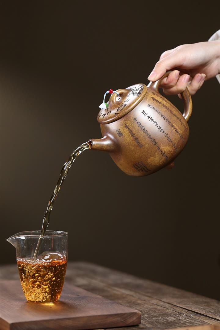 【泥料特點】砂土氣重,似淳實農民,日久使用,漸露鋒芒,養成變化,溫潤莊重。紫砂是壹種雙重氣孔結構的多孔性材質,氣孔微細,密度高。用紫砂壺沏茶,不失原味,且香不渙散,得茶之真香真味。紫砂使用越久,壺身色澤越發光亮照人,氣韻溫雅。紫砂壺長久使用器身會因撫摸擦拭,變得越發溫潤光澤。