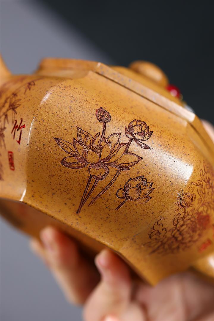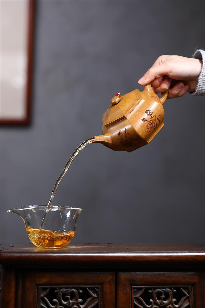 【泥料特點】砂土氣重,似淳實農民,日久使用,漸露鋒芒,養成變化,溫潤莊重。紫砂是壹種雙重氣孔結構的多孔性材質,氣孔微細,密度高。用紫砂壺沏茶,不失原味,且香不渙散,得茶之真香真味。紫砂使用越久,壺身色澤越發光亮照人,氣韻溫雅。紫砂壺長久使用器身會因撫摸擦拭,變得越發溫潤光澤。