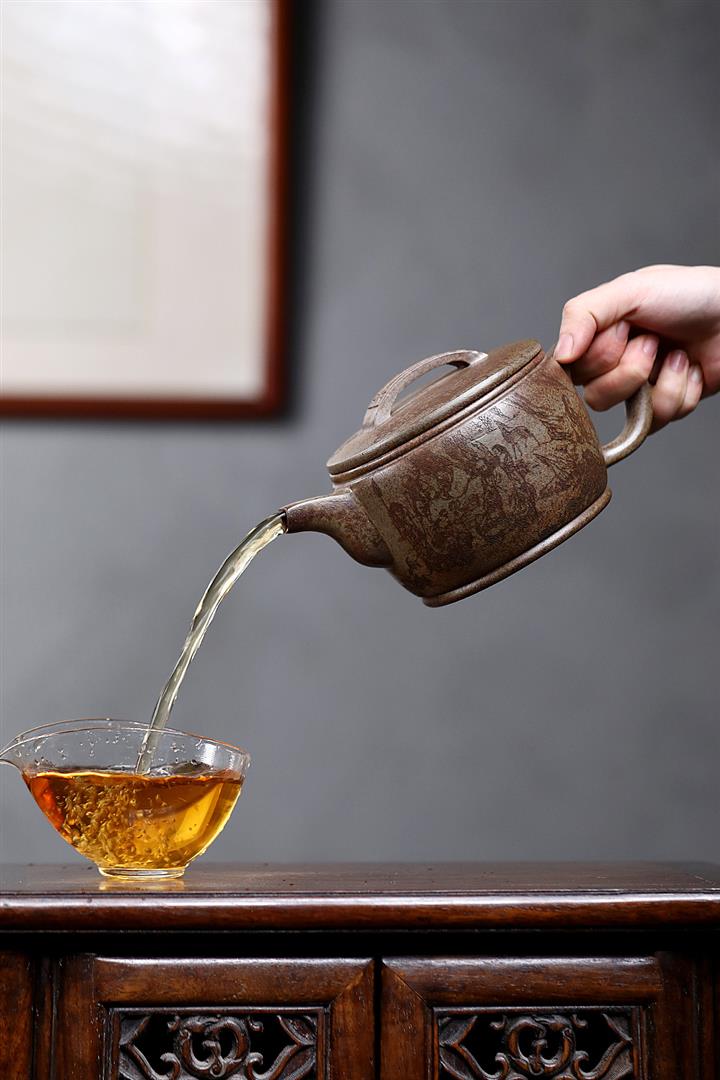 【泥料特點】砂土氣重,似淳實農民,日久使用,漸露鋒芒,養成變化,溫潤莊重。紫砂是壹種雙重氣孔結構的多孔性材質,氣孔微細,密度高。用紫砂壺沏茶,不失原味,且香不渙散,得茶之真香真味。紫砂使用越久,壺身色澤越發光亮照人,氣韻溫雅。紫砂壺長久使用器身會因撫摸擦拭,變得越發溫潤光澤。