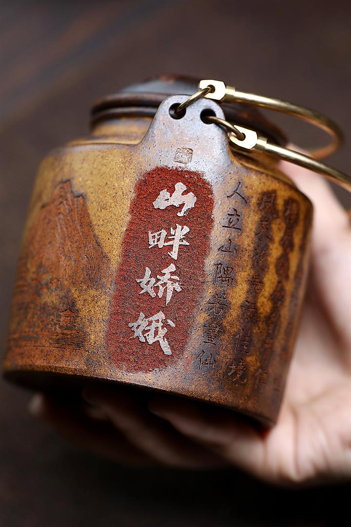 180cc原礦豆青砂竹刻虛扁泡茶壺POT9784