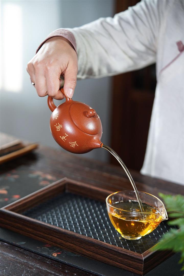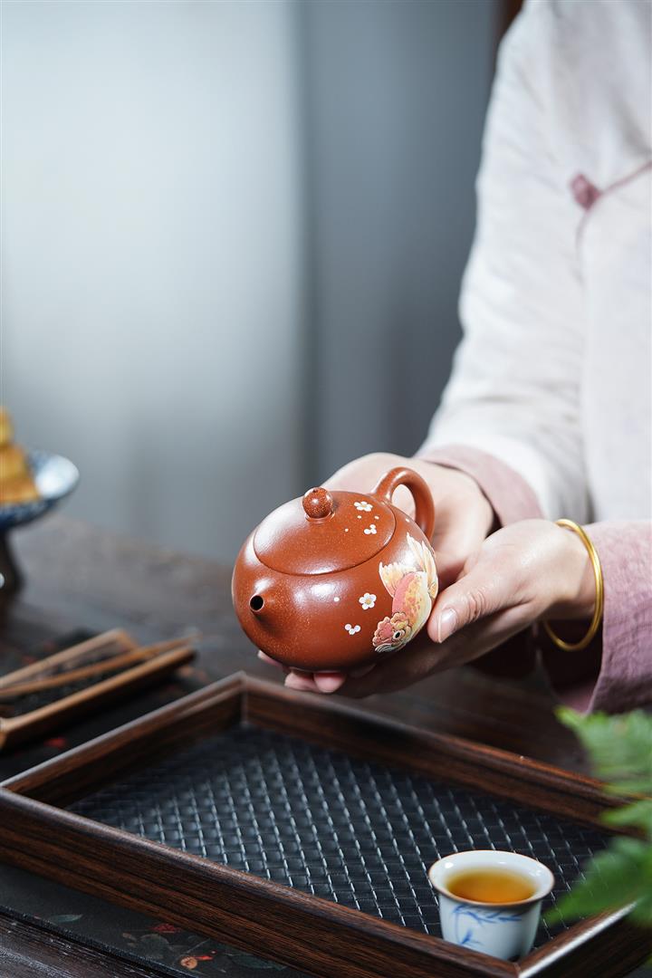 【泥料特點】砂土氣重,似淳實農民,日久使用,漸露鋒芒,養成變化,溫潤莊重。紫砂是壹種雙重氣孔結構的多孔性材質,氣孔微細,密度高。用紫砂壺沏茶,不失原味,且香不渙散,得茶之真香真味。紫砂使用越久,壺身色澤越發光亮照人,氣韻溫雅。紫砂壺長久使用器身會因撫摸擦拭,變得越發溫潤光澤。