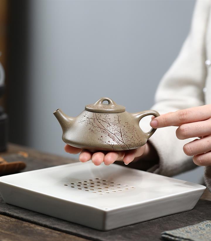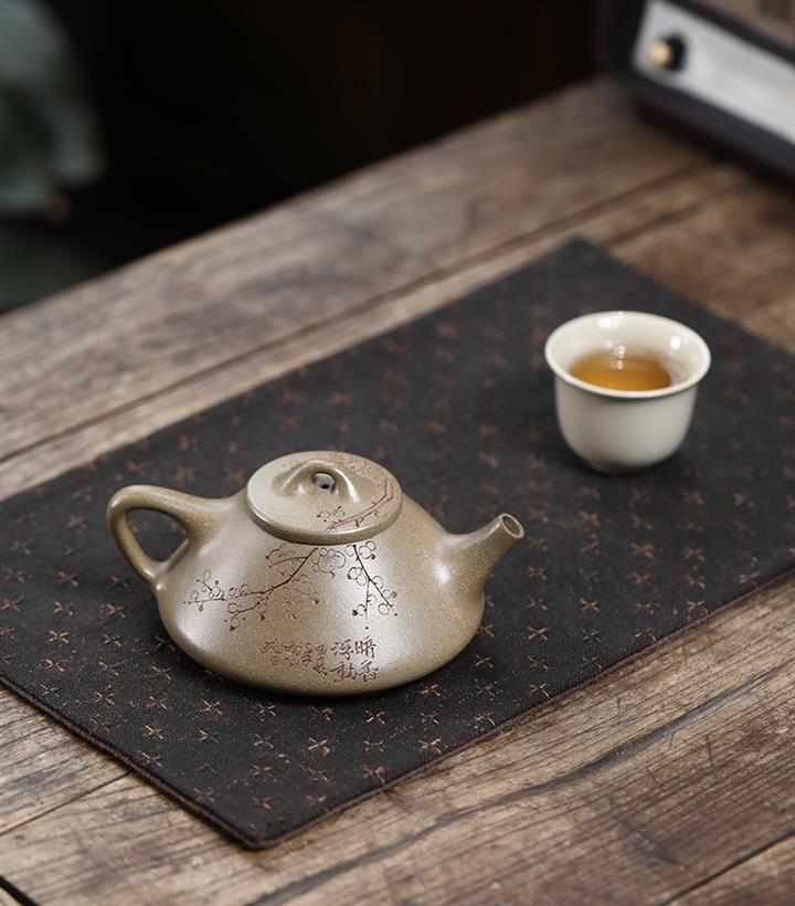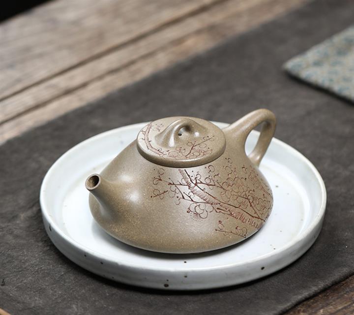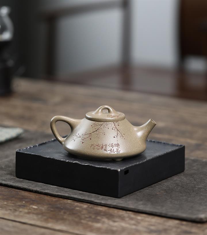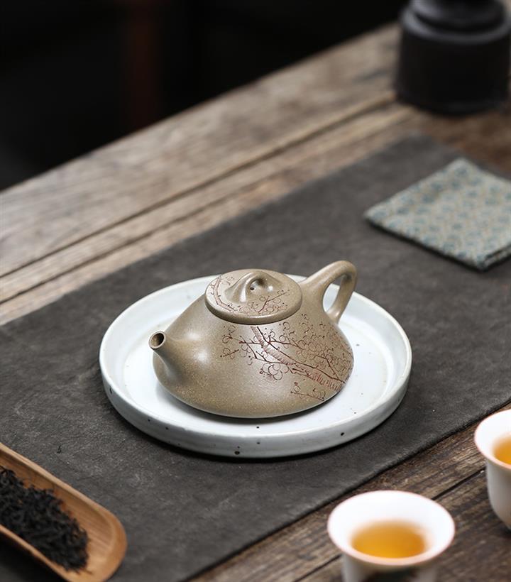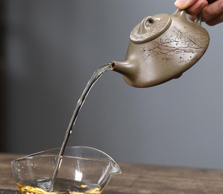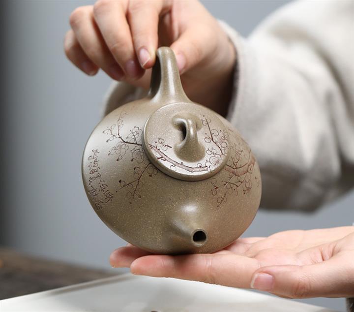 【泥料特點】砂土氣重,似淳實農民,日久使用,漸露鋒芒,養成變化,溫潤莊重。紫砂是壹種雙重氣孔結構的多孔性材質,氣孔微細,密度高。用紫砂壺沏茶,不失原味,且香不渙散,得茶之真香真味。紫砂使用越久,壺身色澤越發光亮照人,氣韻溫雅。紫砂壺長久使用器身會因撫摸擦拭,變得越發溫潤光澤。