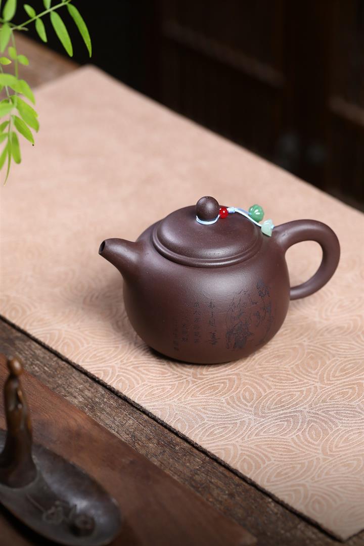 【泥料特點】砂土氣重,似淳實農民,日久使用,漸露鋒芒,養成變化,溫潤莊重。紫砂是壹種雙重氣孔結構的多孔性材質,氣孔微細,密度高。用紫砂壺沏茶,不失原味,且香不渙散,得茶之真香真味。紫砂使用越久,壺身色澤越發光亮照人,氣韻溫雅。紫砂壺長久使用器身會因撫摸擦拭,變得越發溫潤光澤。