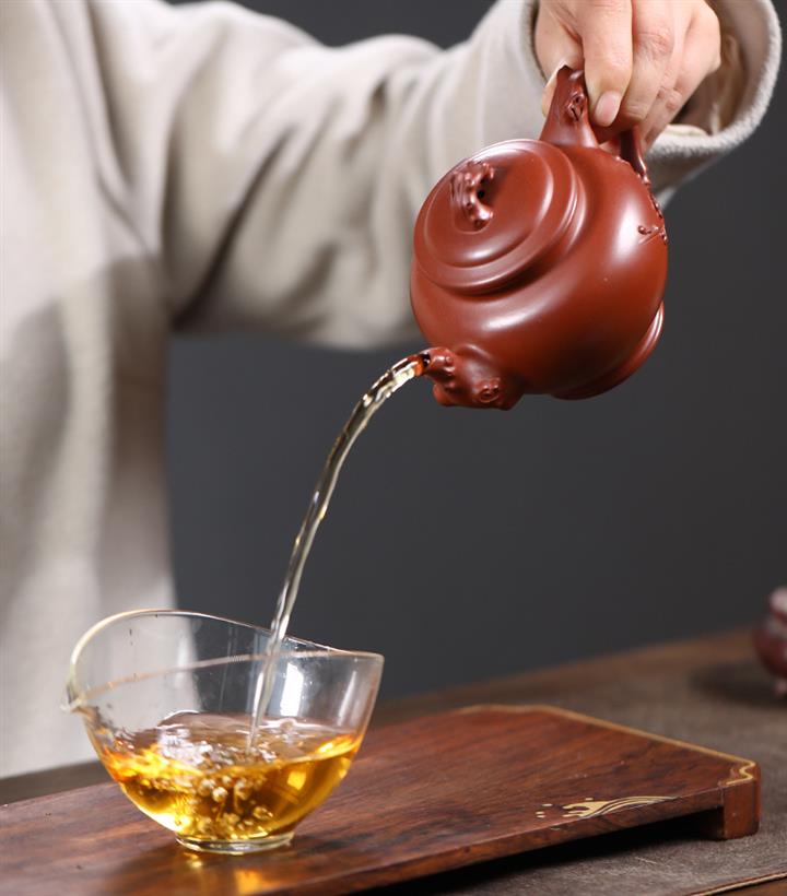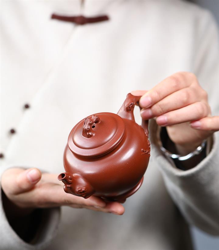 【泥料特點】砂土氣重,似淳實農民,日久使用,漸露鋒芒,養成變化,溫潤莊重。紫砂是壹種雙重氣孔結構的多孔性材質,氣孔微細,密度高。用紫砂壺沏茶,不失原味,且香不渙散,得茶之真香真味。紫砂使用越久,壺身色澤越發光亮照人,氣韻溫雅。紫砂壺長久使用器身會因撫摸擦拭,變得越發溫潤光澤。
