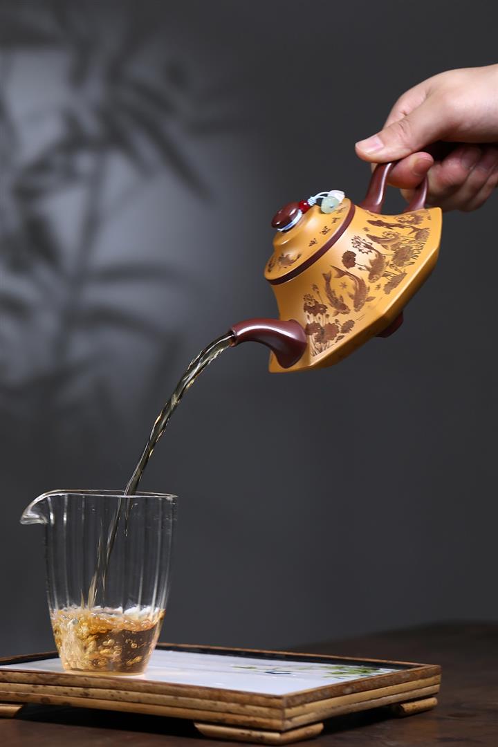 【泥料特點】砂土氣重,似淳實農民,日久使用,漸露鋒芒,養成變化,溫潤莊重。紫砂是壹種雙重氣孔結構的多孔性材質,氣孔微細,密度高。用紫砂壺沏茶,不失原味,且香不渙散,得茶之真香真味。紫砂使用越久,壺身色澤越發光亮照人,氣韻溫雅。紫砂壺長久使用器身會因撫摸擦拭,變得越發溫潤光澤。