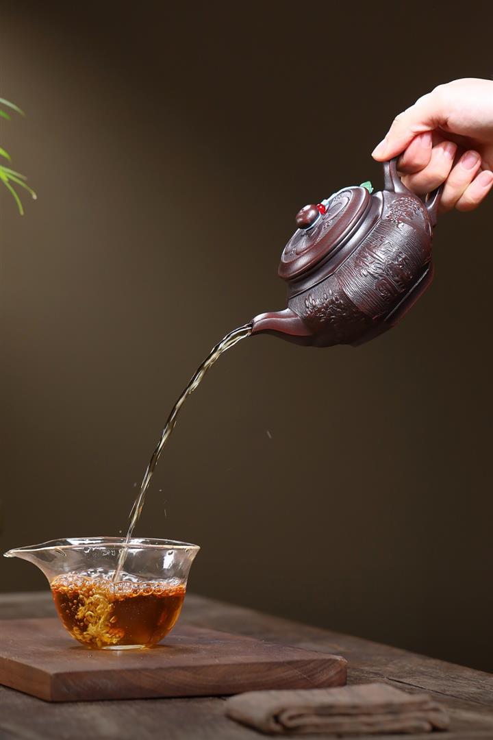 【泥料特點】砂土氣重,似淳實農民,日久使用,漸露鋒芒,養成變化,溫潤莊重。紫砂是壹種雙重氣孔結構的多孔性材質,氣孔微細,密度高。用紫砂壺沏茶,不失原味,且香不渙散,得茶之真香真味。紫砂使用越久,壺身色澤越發光亮照人,氣韻溫雅。紫砂壺長久使用器身會因撫摸擦拭,變得越發溫潤光澤。
