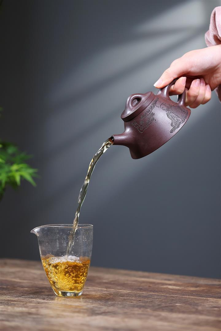 【泥料特點】砂土氣重,似淳實農民,日久使用,漸露鋒芒,養成變化,溫潤莊重。紫砂是壹種雙重氣孔結構的多孔性材質,氣孔微細,密度高。用紫砂壺沏茶,不失原味,且香不渙散,得茶之真香真味。紫砂使用越久,壺身色澤越發光亮照人,氣韻溫雅。紫砂壺長久使用器身會因撫摸擦拭,變得越發溫潤光澤。