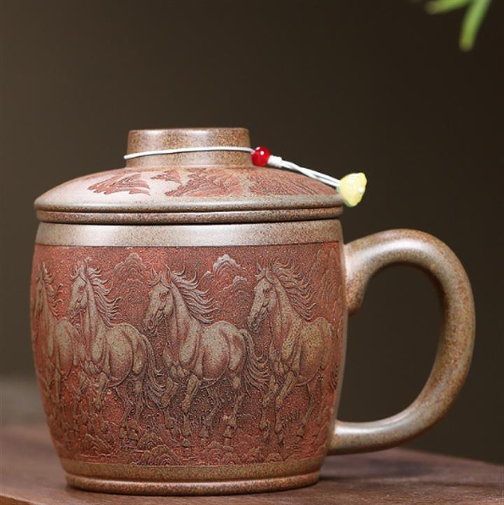 440cc原礦沈香泥柴燒八駿圖蓋杯茶杯POT10064