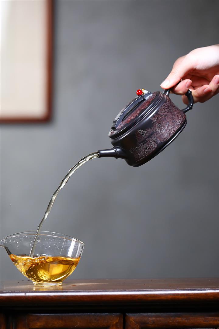 【泥料特點】砂土氣重,似淳實農民,日久使用,漸露鋒芒,養成變化,溫潤莊重。紫砂是壹種雙重氣孔結構的多孔性材質,氣孔微細,密度高。用紫砂壺沏茶,不失原味,且香不渙散,得茶之真香真味。紫砂使用越久,壺身色澤越發光亮照人,氣韻溫雅。紫砂壺長久使用器身會因撫摸擦拭,變得越發溫潤光澤。