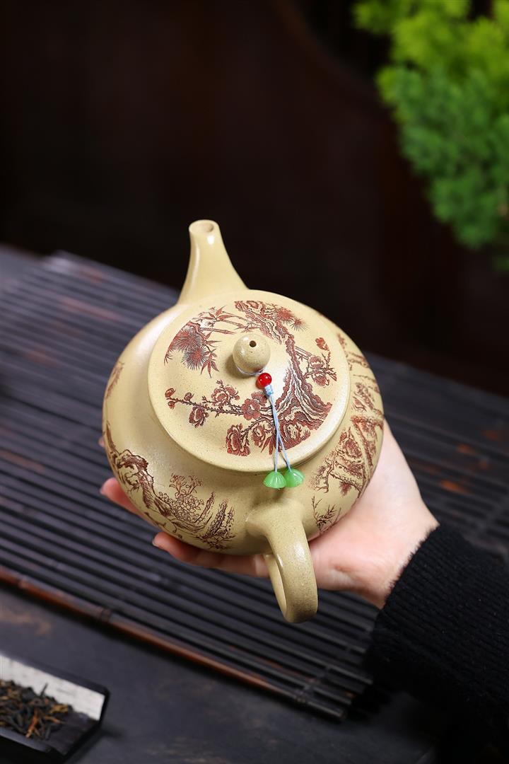 【泥料特點】砂土氣重,似淳實農民,日久使用,漸露鋒芒,養成變化,溫潤莊重。紫砂是壹種雙重氣孔結構的多孔性材質,氣孔微細,密度高。用紫砂壺沏茶,不失原味,且香不渙散,得茶之真香真味。紫砂使用越久,壺身色澤越發光亮照人,氣韻溫雅。紫砂壺長久使用器身會因撫摸擦拭,變得越發溫潤光澤。
