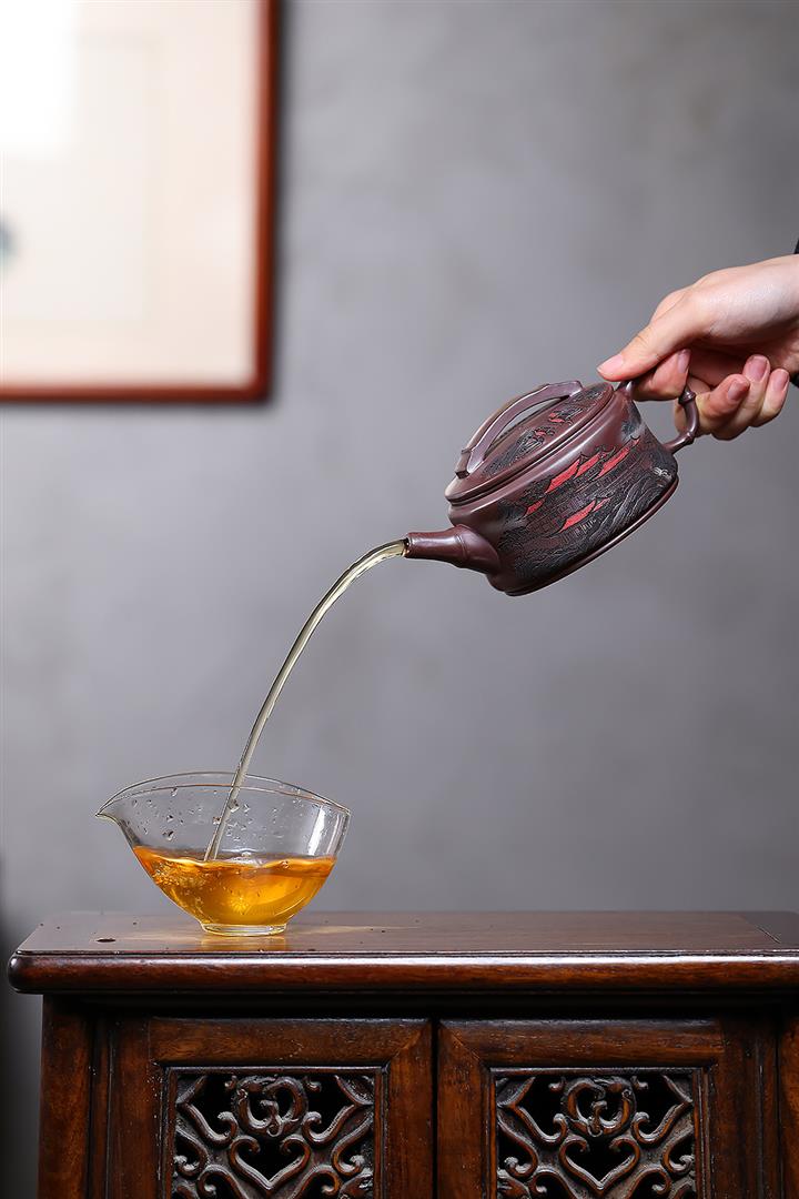 【泥料特點】砂土氣重,似淳實農民,日久使用,漸露鋒芒,養成變化,溫潤莊重。紫砂是壹種雙重氣孔結構的多孔性材質,氣孔微細,密度高。用紫砂壺沏茶,不失原味,且香不渙散,得茶之真香真味。紫砂使用越久,壺身色澤越發光亮照人,氣韻溫雅。紫砂壺長久使用器身會因撫摸擦拭,變得越發溫潤光澤。